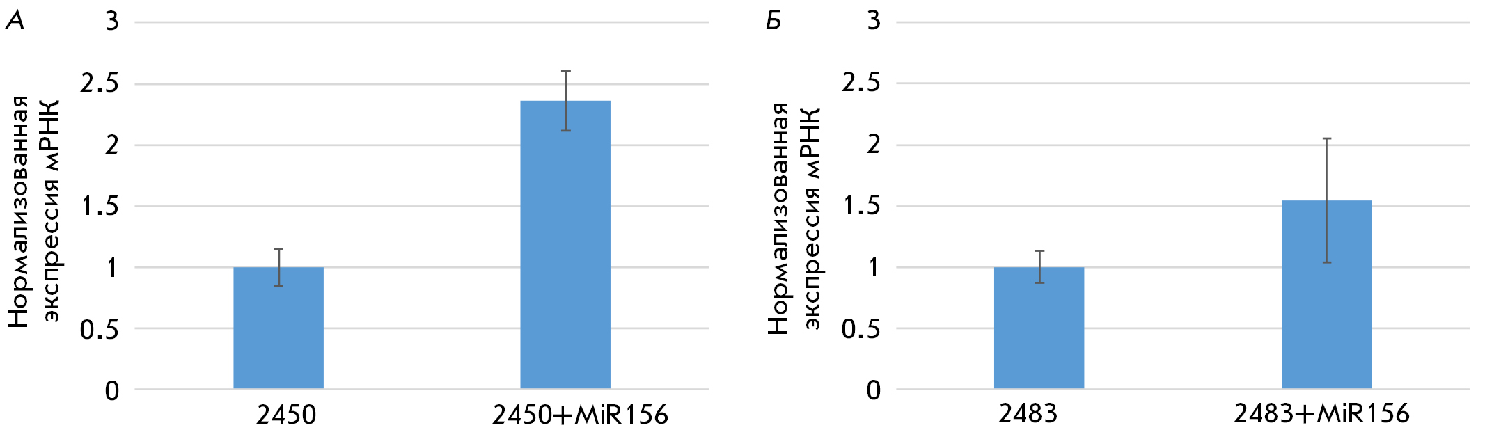 Рис. 3. Результаты кПЦР по измерению уровня экспрессии матрицы для miPEP156a в трансгенных растениях мха P. patens линий 2450 (А) и 2483 (Б). Для каждого из пяти независимых повторов РНК выделяли из пяти проб мха, выросших в разные периоды времени. Указаны средние статистические значения в виде столбчатой диаграммы и стандартные отклонения. Статистическая значимость различий сумм значений в контрольных экспериментах (без инкубации с пептидом) и опытных экспериментов (с добавлением пептида miPEP156a) составляла для этих двух выборок p < 0.05 согласно критерию Стьюдента (расчет на основе программы GraphPad Prism 7.0 – (https:// graphpad_prism.software.informer.com/7.0/))
