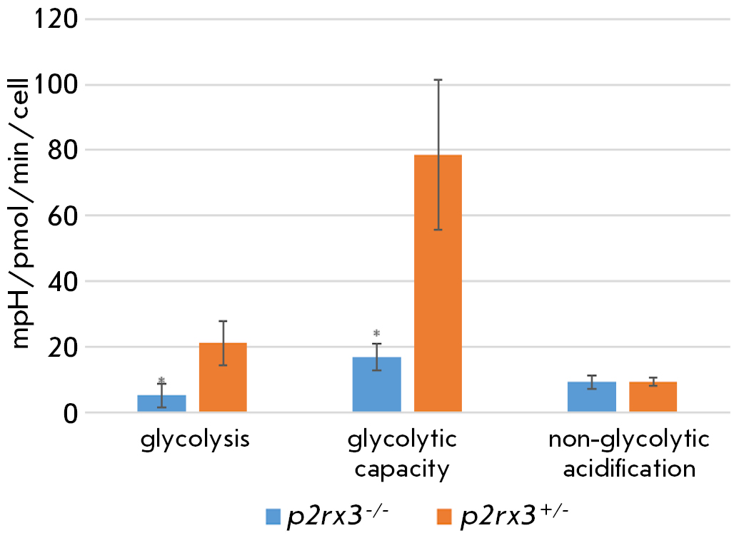 Fig. 3. Glycolytic function indices of the primary mixed culture of hippocampal neurons from p2rx3 knockout mice. * – significance of differences at p < 0.05 compared to heterozygotes according to the Mann–Whitney U test