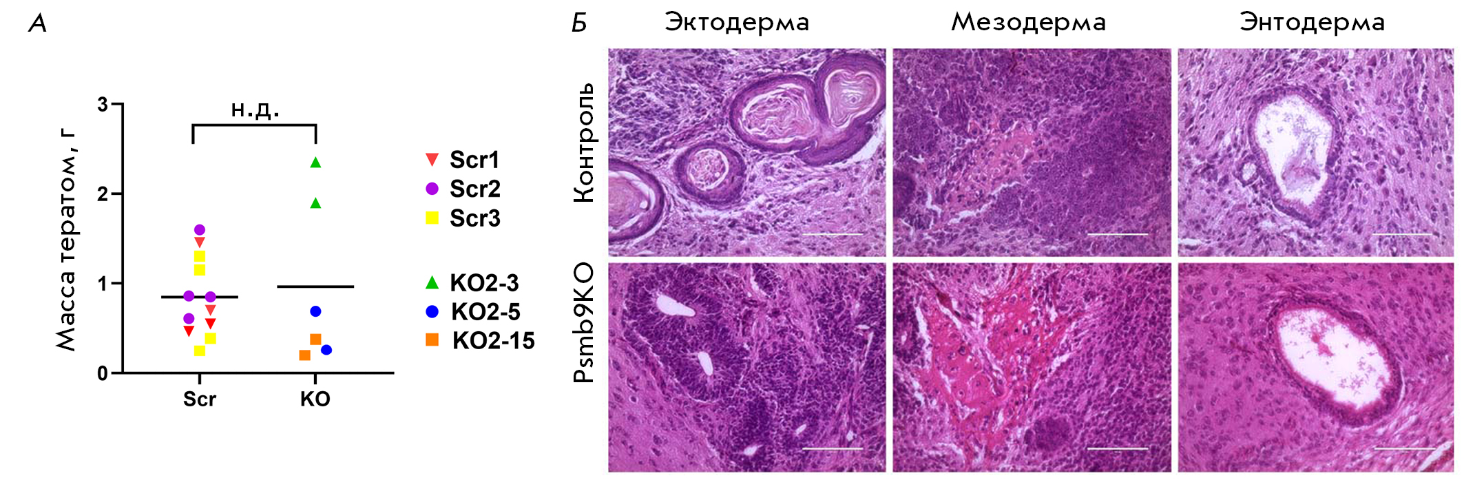 Рис. 4. Оценка плюрипотентных свойств in vivo линий ЭСК с нокаутом гена Psmb9 с помощью тератомного теста. А – на диаграмме представлены индивидуальные значения массы тератом, образованных контрольными клетками (Scr) и линиями Psmb9KO. Горизонтальная линия обозначает среднее значение массы тератом для каждой группы. н.д. – статистически недостоверно (однофакторный дисперсионный анализ). Б – гистологический анализ тератом, образованных Psmb9KO ЭСК. Во всех тератомах обнаружены ткани, характерные для производных трех зародышевых листков: эктодермы (ороговевающий эпителий и нейроэпителиальные розетки), мезодермы (хондробласты и хондроциты в мезенхиме) и энтодермы (дифференцирующийся энтеродермальный эпителий). Окраска гематоксилином и эозином. Масштабный отрезок – 100 мкм