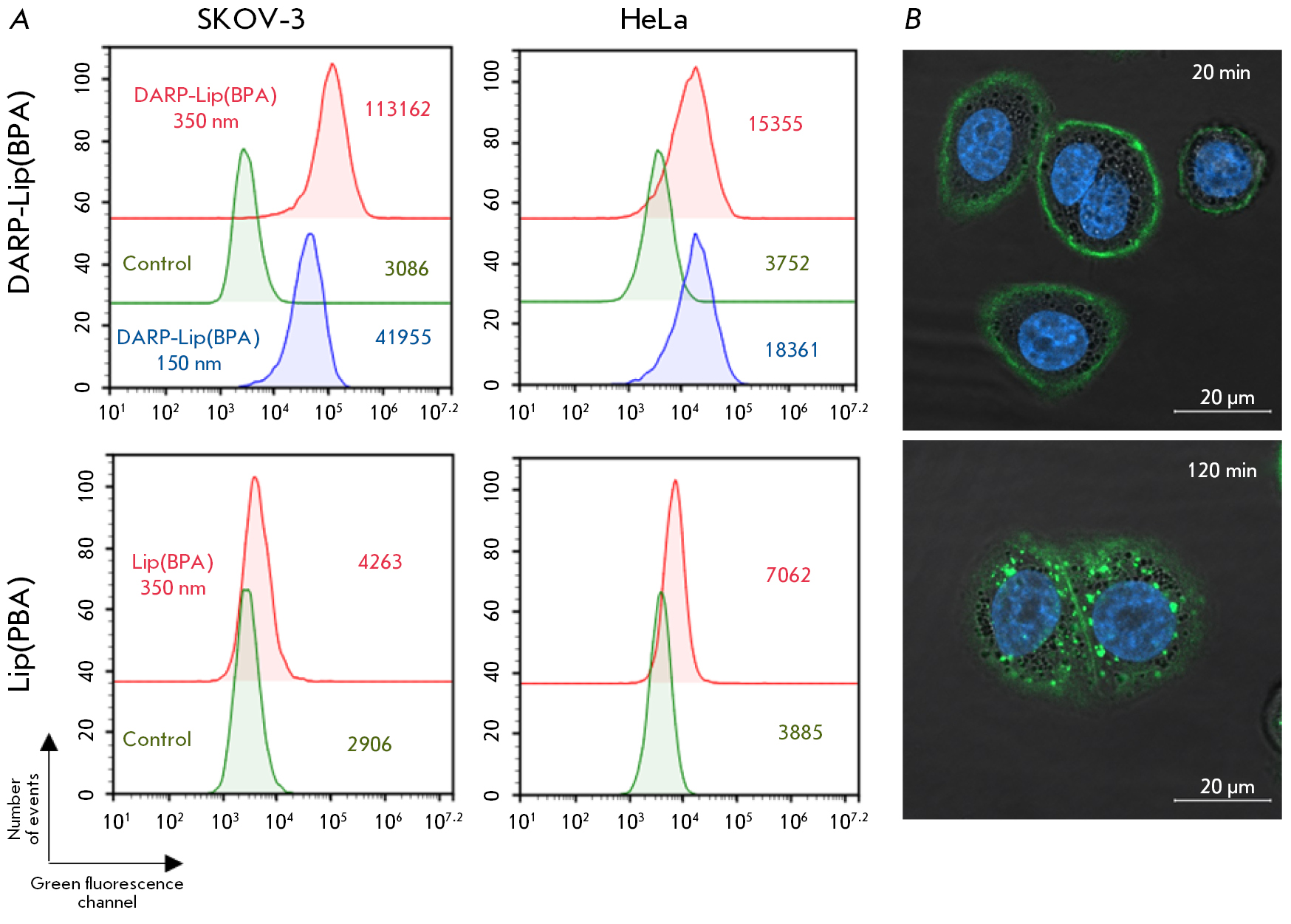 Для оценки способности связывания DARP-Lip(BPA) с рецептором HER2 200 000 клеток SKOV-3 и Hela инкубировали в полной ростовой среде в течение 10 мин при 37ºС с различными концентрациями (350 или 150 нМ) DARP-Lip(BPA)-AF488 (концентрация указана по красителю; концентрация DARPin-модифицированных липосом составляла 1 и 0.5 нМ соответственно). После окончания инкубации клетки трижды промывали PBS и анализировали на приборе NovoCyte 3000.
