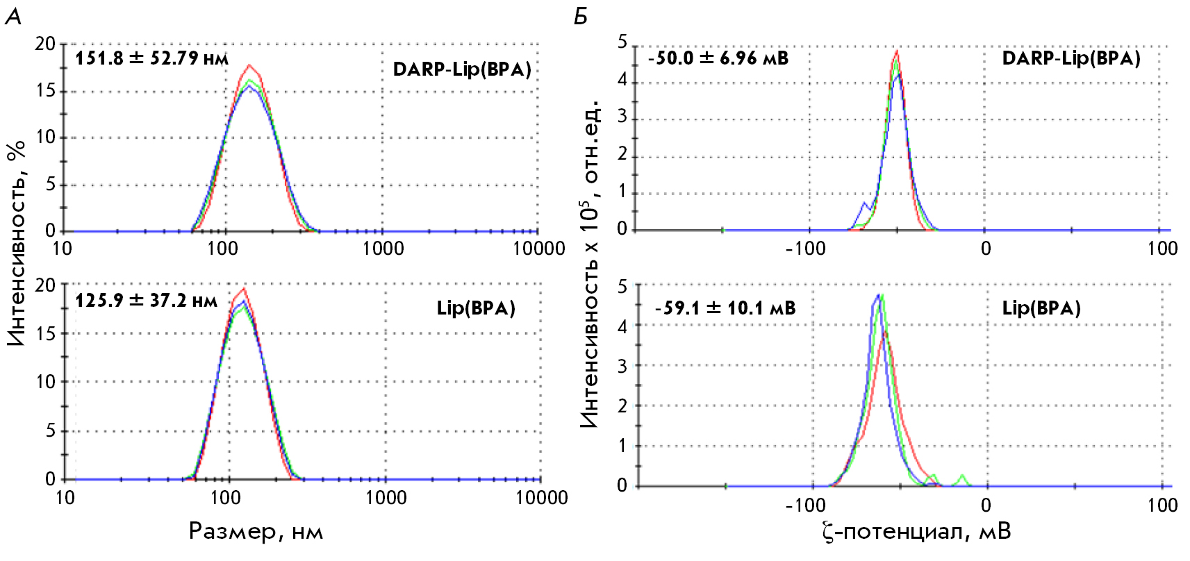 Рис. 2. Характеристика гидродинамического диаметра и ζ-потенциала 10BPA-содержащих липосом, модифицированных и немодифицированных DARPin_9-29. А – гидродинамический размер DARP-Lip(BPA) и Lip(BPA). Б – ζ-потенциал DARP-Lip(BPA) и Lip(BPA)