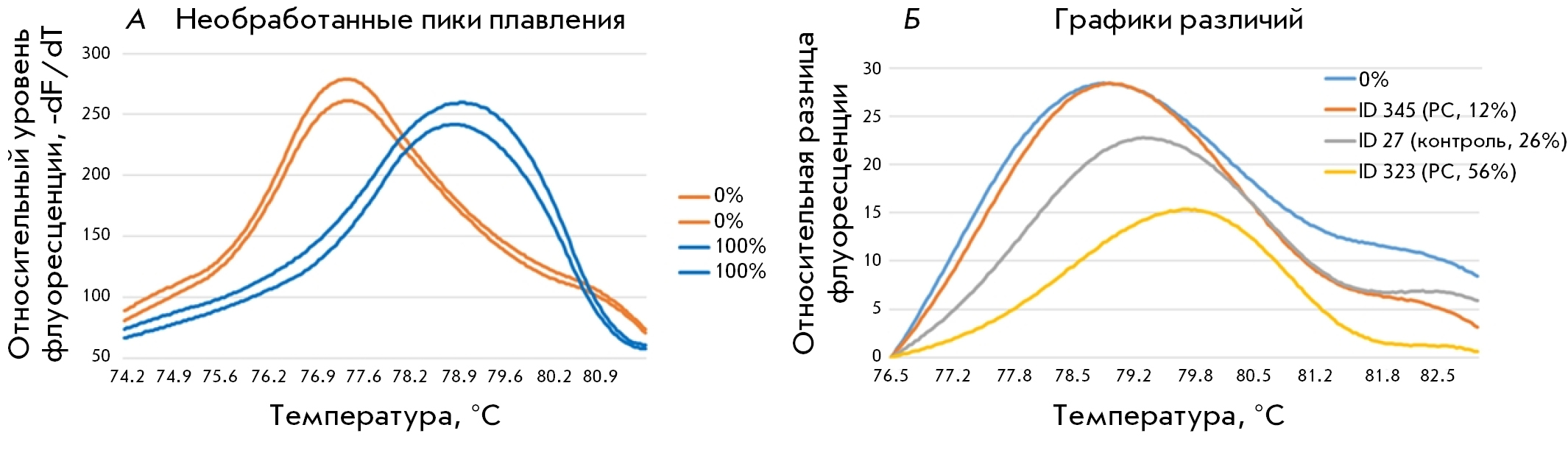 Fig. 1. Assessment of LINE-1 methylation levels via methyl-sensitive high-resolution melting curve analysis (MS-HRM). (A) – raw melting curves and melting peaks of fully methylated (100%) and fully unmethylated (0%) standard samples; (B) – melting curves for the standard sample (0%) and the three tested samples with high (56%), low (12%), and medium (26%) methylation levels, converted to difference plots