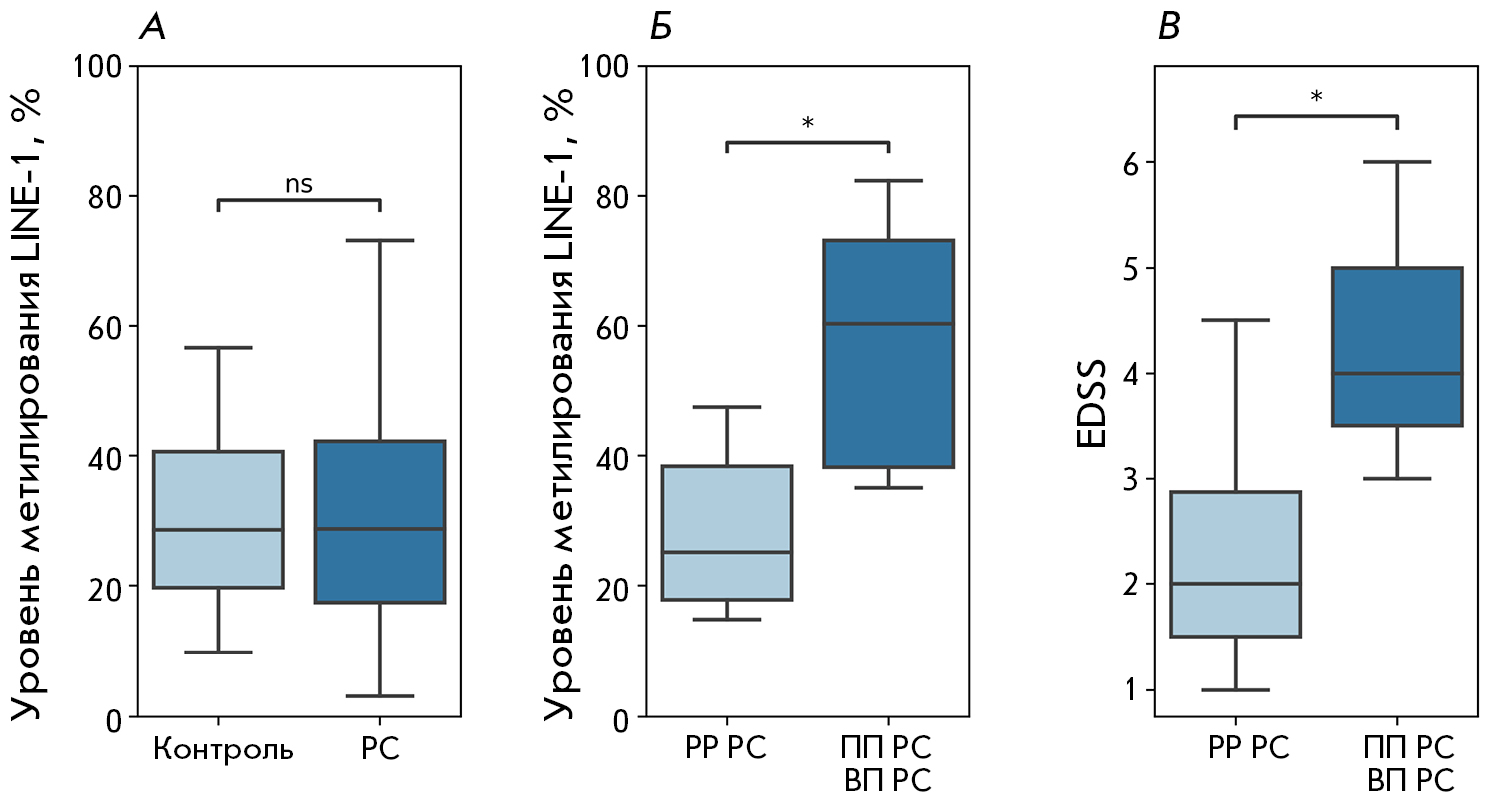 Fig. 2. LINE-1 methylation levels in peripheral blood mononuclear cells. (A) – comparison of indices in the control group and in the group of MS patients; (B) – comparison of indices in patients with RR MS, PP MS, and SP MS; (C) – degree of neurologic deficit in patients with remitting and progressive MS. * – statistically significant differences between groups; p < 0.05; ns – no significant differences