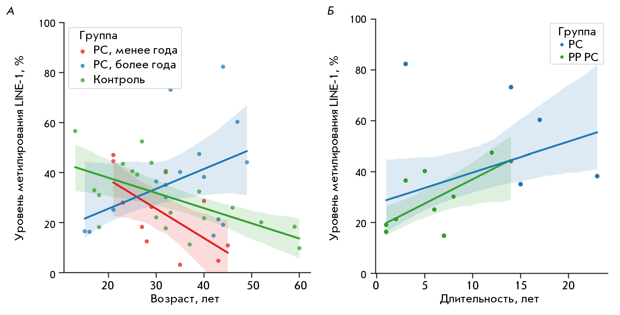 Fig. 3. Correlation analysis data to detect changes in LINE-1 methylation levels. (A) – data from both MS patients and those in the control group; (B) – the blue line shows the correlation between the LINE-1 methylation level and disease duration for the whole group of patients, and the green line shows the results of the analysis of patients with a remitting course (RR MS) and duration of over 1 year