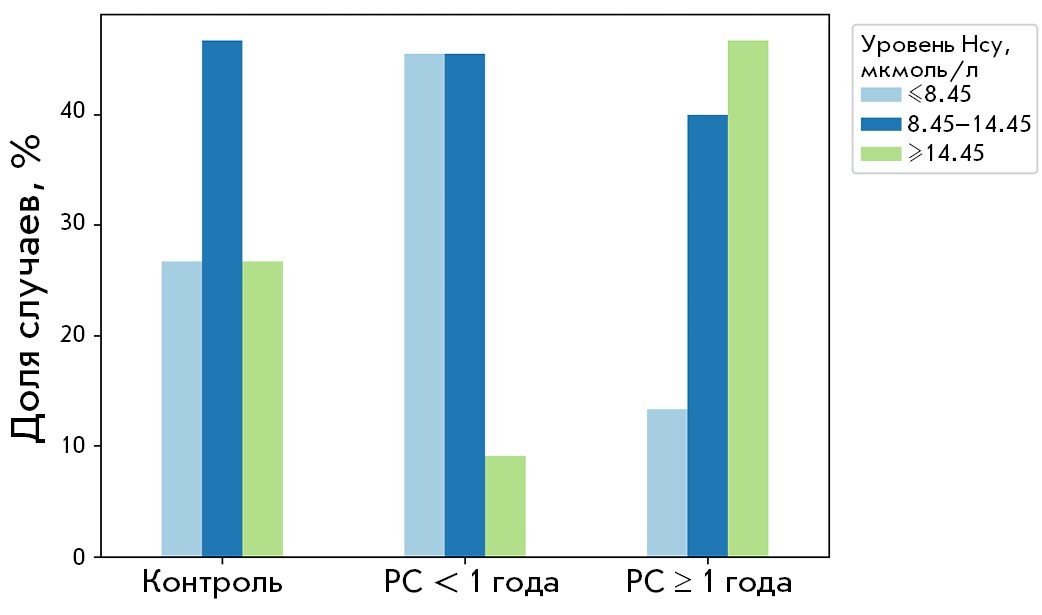 Our earlier work identified the changes in folate metabolism parameters specific to the initial stage of MS (notably, decreased homocysteine levels at adult MS onset) [21]. Hence, in this work, we evaluated folate metabolism parameters across all MS patients, with a separate analysis for those with disease durations of less than and greater than a year. Using this approach, we found that in the group of patients with MS, those with a duration of less than 1 year had predominantly low and medium values of homocysteine levels. In contrast, high and medium values were predominant in the prolonged course (Fig. 4). Homocysteine levels relative to the lower quartile (≤ 8.45 μmol/L) and upper quartile (≥ 14.45 μmol/L) in the control group were taken as low and high levels.