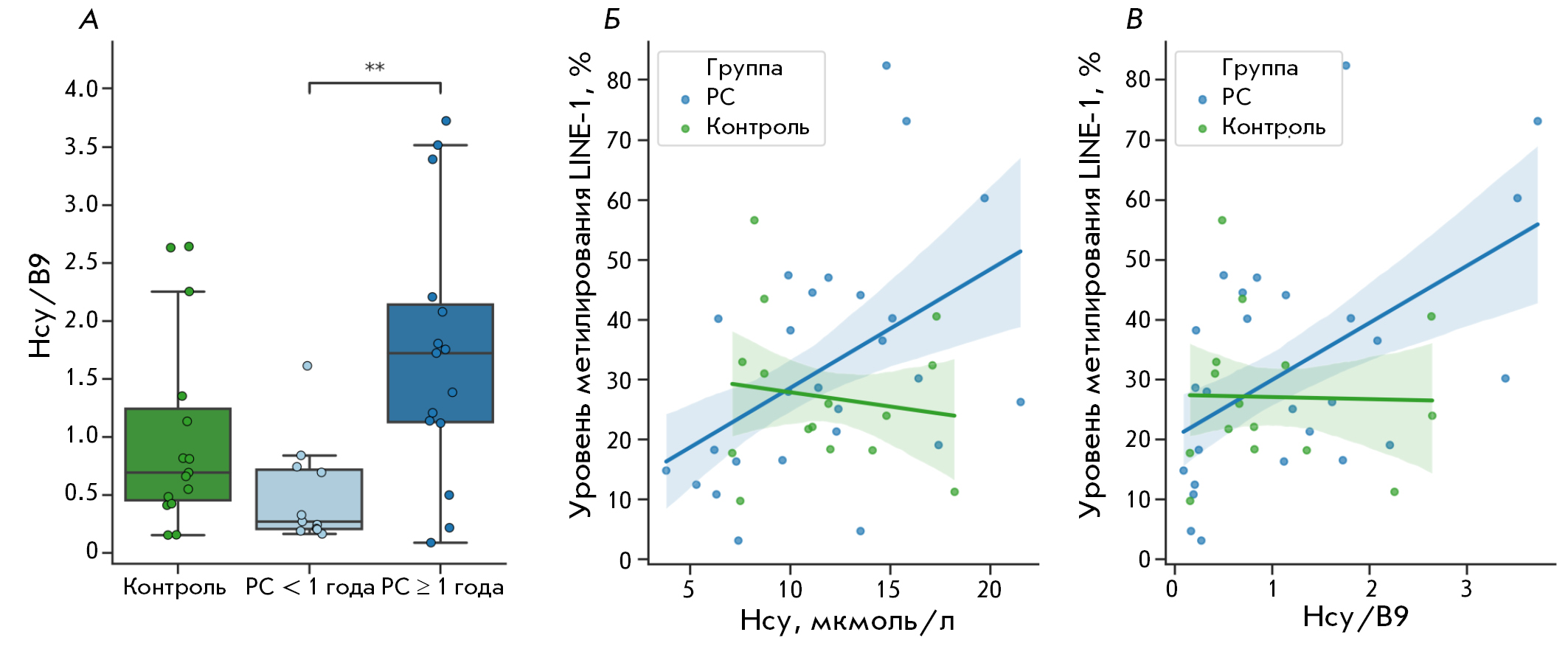 Fig. 5. Alterations in the ratio of serum homocysteine and folic acid concentrations (Hcy/B9) in individuals with MS (A), and the correlation between alterations in homocysteine levels (B) and Hcy/B9 ratios (C) with LINE-1 methylation levels in peripheral blood mononuclear cells. ** – statistically significant differences between the groups, p < 0.05 (Kruskal–Wallis test with subsequent pairwise comparisons)