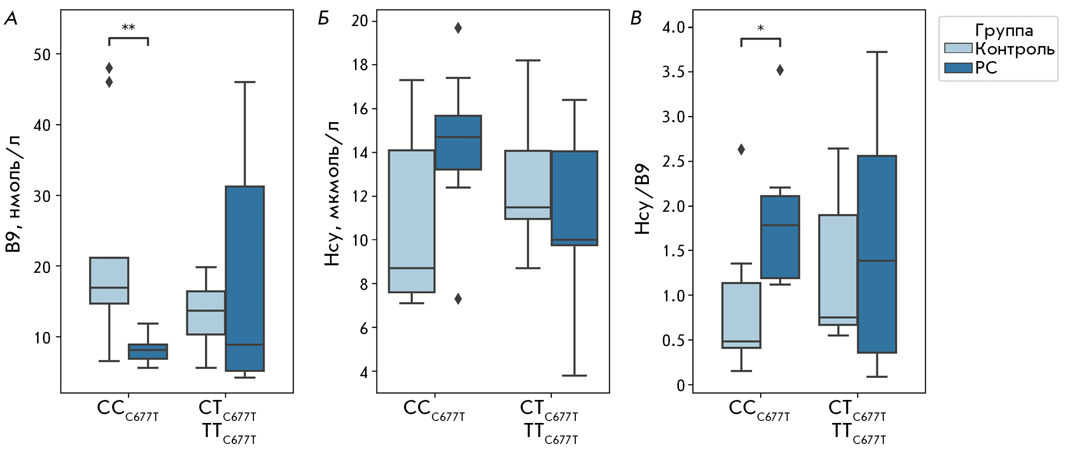 Fig. 6. Concentration of vitamin B9 (A) and homocysteine (B), and the Hcy/B9 ratio (C) in the individuals of the control group and the MS patients depending on the genotype for the C677T polymorphism of the MTHFR gene. ♦ – values deviating from the median by more than 1.5 interquartile range. * – statistically significant differences between the groups, p < 0.05; ** – statistically significant differences between the groups, p < 0.01