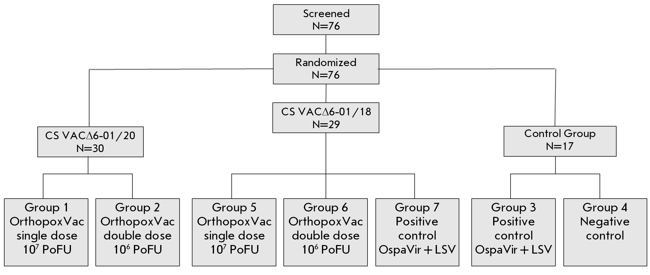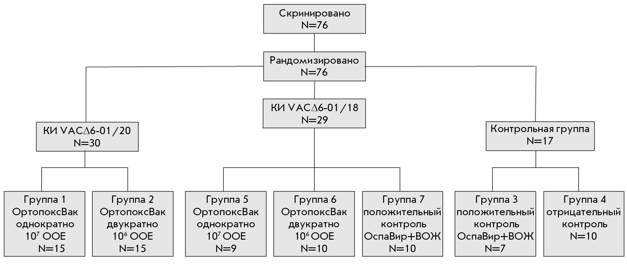 Проведено открытое сравнительное рандомизированное исследование в параллельных группах, в котором приняли участие 76 мужчин и женщин в возрасте от 25 до 40 лет, соответствующих критериям включения и не имеющих критериев невключения, ранее принимавших участие в клинических исследованиях (КИ) вакцины ОртопоксВак I фазы (КИ VAC∆6-01/18) и II/III фаз (КИ VAC∆6-01/20) (рис. 1).