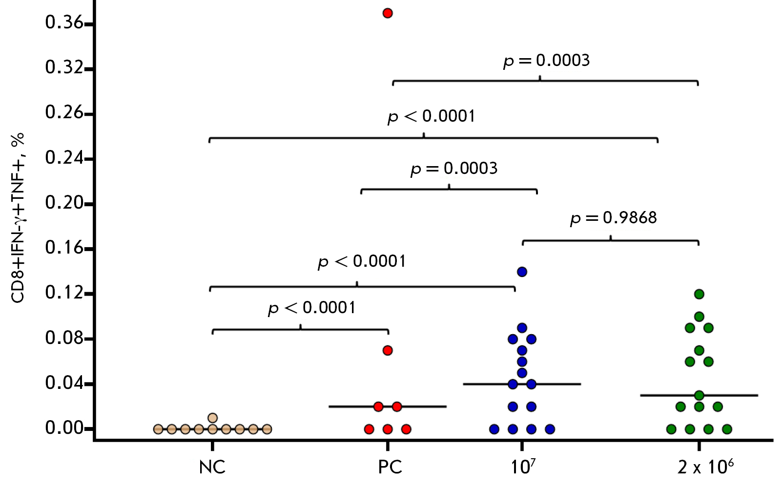 Рис. 5. Процентное содержание ВОВ-специфичных CD8+ Т-клеток, продуцирующих IFN-γ и TNF, в образцах PBMC от добровольцев, вакцинированных противооспенной вакциной в рамках клинических исследований, через 1.5 года после вакцинации. ОК – группа сравнения (отрицательный контроль) – добровольцы, не вакцинированные оспенными вакцинами, не имевшие контакта с пациентами, вакцинированными оспенными вакцинами, и не работавшие с вирусами рода ортопоксвирусов; ПК – группа положительного контроля, состоящая из добровольцев, привитых двухэтапным методом Вакциной оспенной инактивированной ОспаВир и через 7 дней Вакциной оспенной живой на основе штамма Л-ИВП ВОВ (Микроген); 107 – группа добровольцев, привитых однократно внутрикожно вакциной ОртопоксВак в дозе 107 ООЕ/0.2 мл; 2×106 – группа добровольцев, привитых двукратно с интервалом 28 дней внутрикожно вакциной ОртопоксВак в дозе 106 ООЕ/0.2 мл. Значимость различий между группами определяли по F-критерию. Каждая точка соответствует одному добровольцу