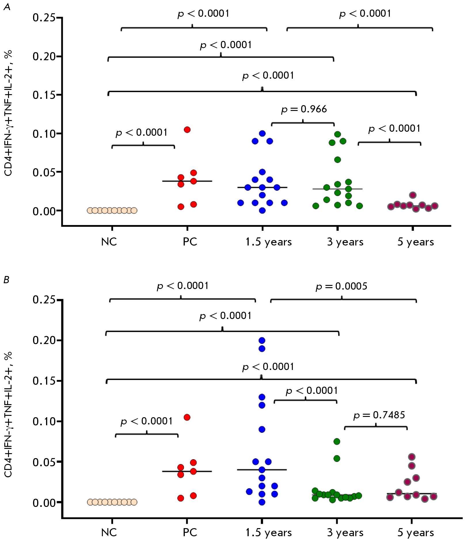 Через 1.5 года после вакцинации в образцах РВМС цитометрически выявили присутствие специфичных для ВОВ клеток – как Т-хелперов (CD4+), так и цитотоксических Т-лимфоцитов (CD8+). После 20-часовой стимуляции РВМС штаммом VACΔ6 ВОВ наблюдали увеличение количества CD4+IFN-γ+ и CD8+IFN-γ+ Т-клеток. При этом до 80–90% антигенспецифичных клеток приходилось на клетки с тройной (CD4+IFN-γ+TNF+IL-2+) или двойной (CD8+IFN-γ+TNF+) экспрессией цитокинов.