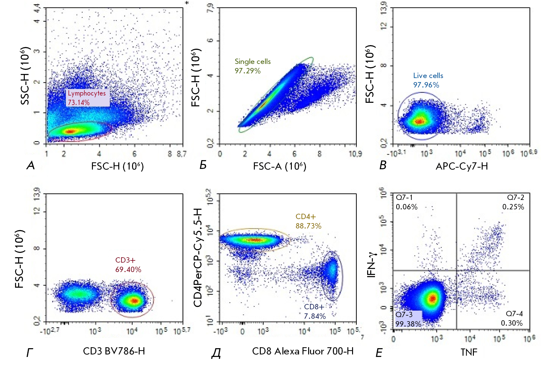 При выполнении цитометрического анализа использовали следующий порядок гейтирования (рис. 2). В координатах прямого и бокового светорассеяния выделяли лимфоцитарную фракцию (рис. 2А), далее отделяли синглеты (одиночные клетки): по оси абсцисс – интегральный сигнал прямого светорассеяния, по оси ординат – пиковый сигнал прямого светорассеяния (рис. 2Б). Из одиночных клеток выделяли живые клетки, негативные по APC-Cy7 (рис. 2В). По уровню экспрессии CD3 гейтировали Т-клетки, позитивные по BV786 (рис. 2Г). Дифференциацию цитотоксических Т-лимфоцитов (фенотип CD3+CD8+) от Т-хелперов (фенотип CD3+CD4+) проводили согласно гистограмме на рис. 2Д. На графике рис. 2Е указаны Т-хелперы, позитивные по цитокинам TNF и IFN-γ.