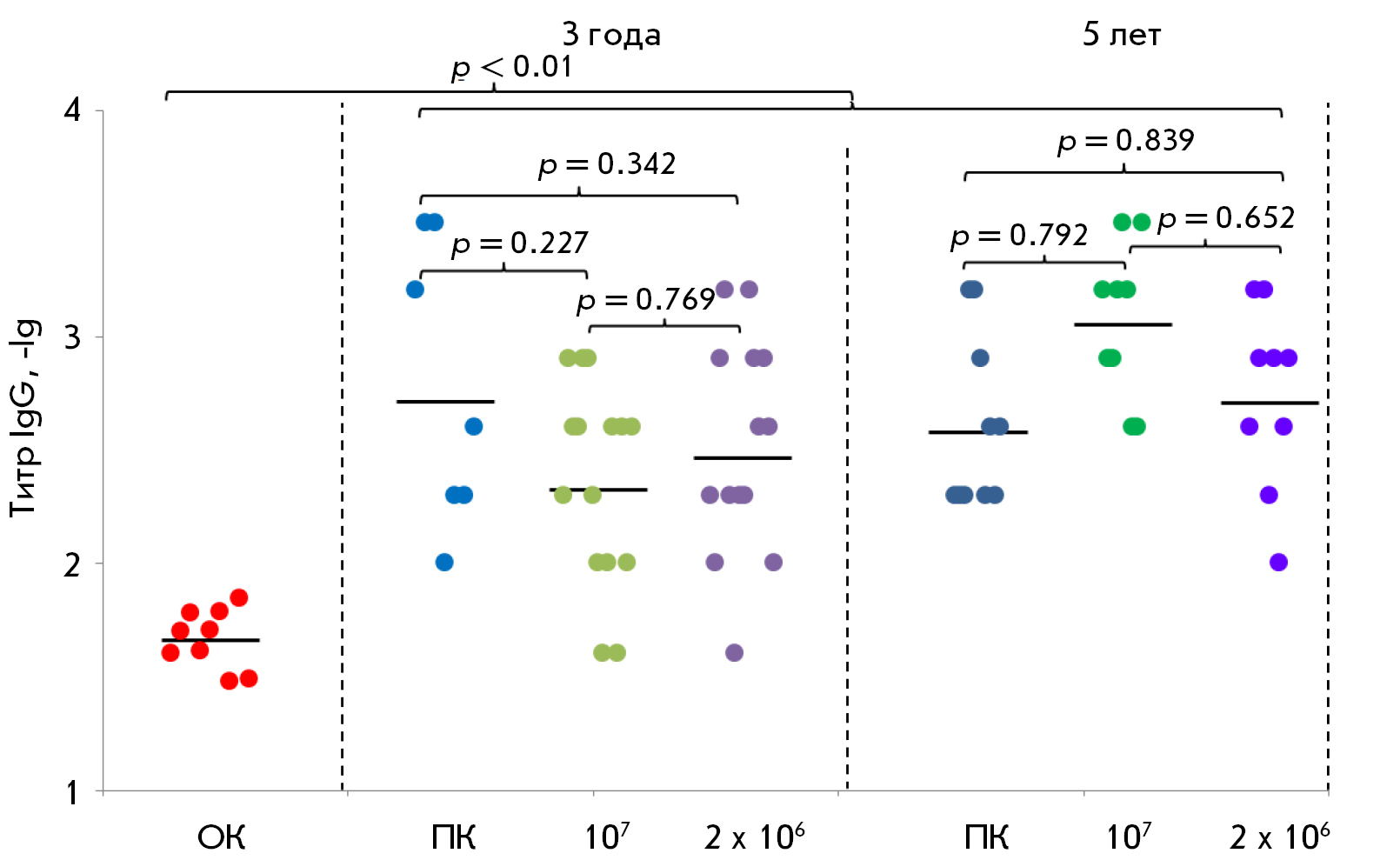 Достоверные отличия выявлены только в группе ОК по отношению к другим трем группам через 3 года и через 5 лет после вакцинации (рис. 3). В остальных парах групп отличия недостоверны.