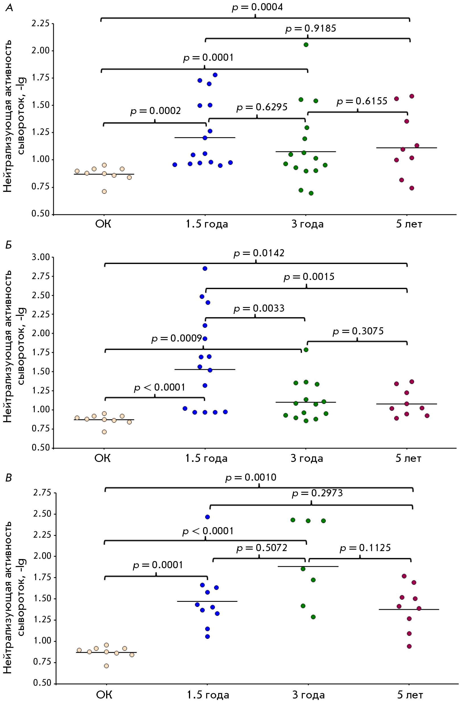 Рис. 4. Нейтрализующая активность сывороток крови добровольцев, вакцинированных в рамках I и II/III фаз клинических исследований вакцины ОртопоксВак. Титры вируснейтрализующих антител определены с помощью реакции подавления бляшкообразования ВОВ (штамм Л-ИВП) на культуре клеток CV-1. Данные представлены в виде –lg; каждая точка соответствует одному добровольцу; горизонтальные линии – уровни GMT антител в группах; значимость различий между группами определяли по F-критерию. Представлены данные по титрам ВНА через 1.5, 3 и 5 лет для: А – группа добровольцев, привитых однократно внутрикожно вакциной ОртопоксВак в дозе 107 ООЕ/0.2 мл; Б – группа добровольцев, привитых двукратно с интервалом 28 дней внутрикожно вакциной ОртопоксВак в дозе 106 ООЕ/0.2 мл; В – группа положительного контроля (добровольцы, привитые двухэтапным методом Вакциной оспенной инактивированной ОспаВир и через 7 дней Вакциной оспенной живой); ОК – группа сравнения (отрицательный контроль) – добровольцы, не вакцинированные оспенными вакцинами, не имевшие контакта с пациентами, вакцинированными оспенными вакцинами, и не работавшие с вирусами рода ортопоксвирусов