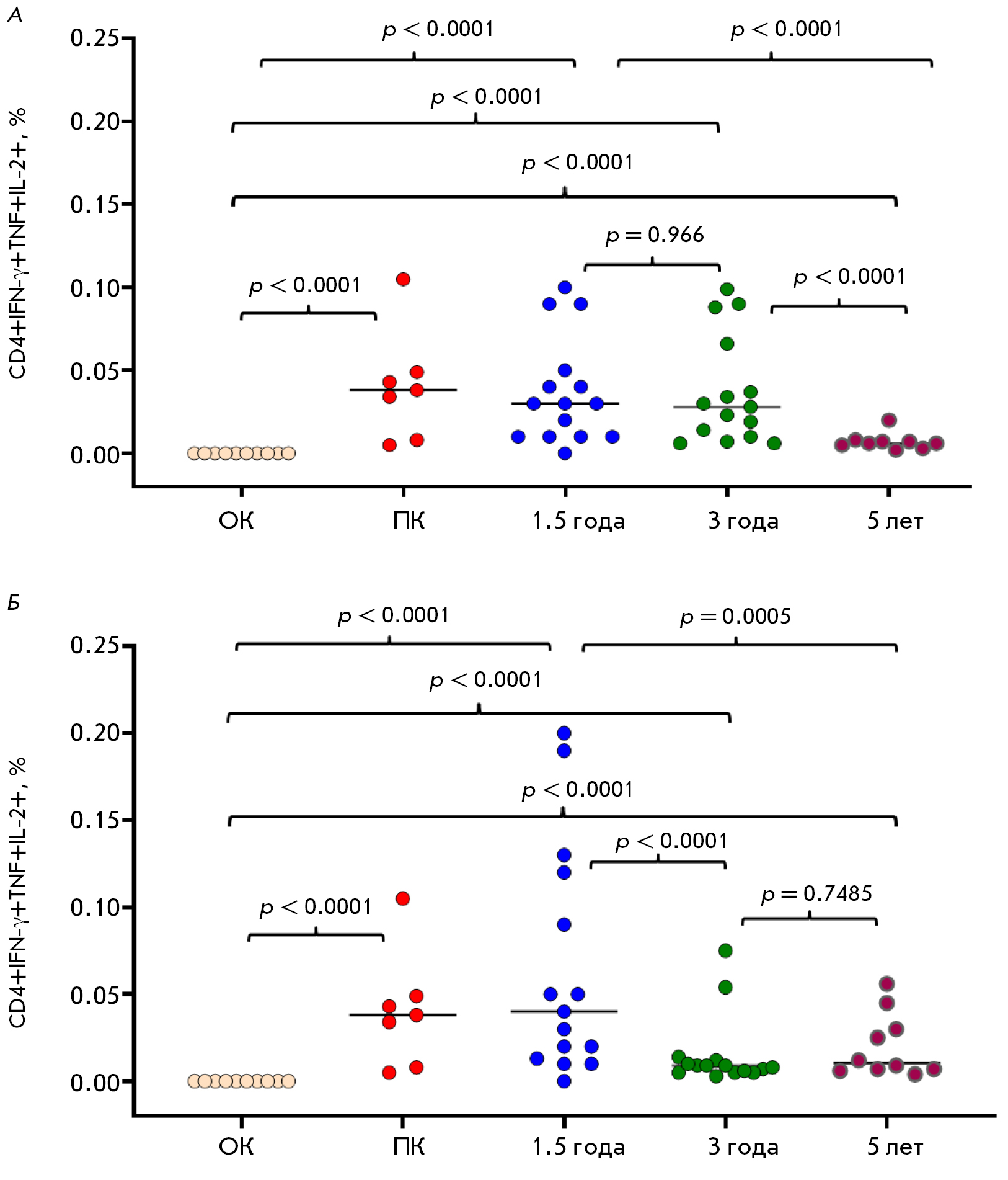 Рис. 6. Процентное содержание ВОВ-специфичных CD4+ Т-клеток, продуцирующих IFN-γ, TNF и IL-2, в образцах PBMC от добровольцев, вакцинированных противооспенной вакциной в рамках клинических исследований. А – группы добровольцев, привитых однократно внутрикожно вакциной ОртопоксВак в дозе 107 ООЕ/0.2 мл; Б – группы добровольцев, привитых двукратно с интервалом 28 дней внутрикожно вакциной ОртопоксВак в дозе 106 ООЕ/0.2 мл. ОК – группа сравнения (отрицательный контроль) – добровольцы, не вакцинированные оспенными вакцинами, не имевшие контакта с пациентами, вакцинированными оспенными вакцинами, и не работавшие с вирусами рода ортопоксвирусов; ПК – группа положительного контроля – группа добровольцев, привитых двухэтапным методом Вакциной оспенной инактивированной ОспаВир и через 7 дней Вакциной оспенной живой на основе штамма Л-ИВП ВОВ (Микроген). Значимость различий между группами определяли по F-критерию. Каждая точка соответствует одному добровольцу