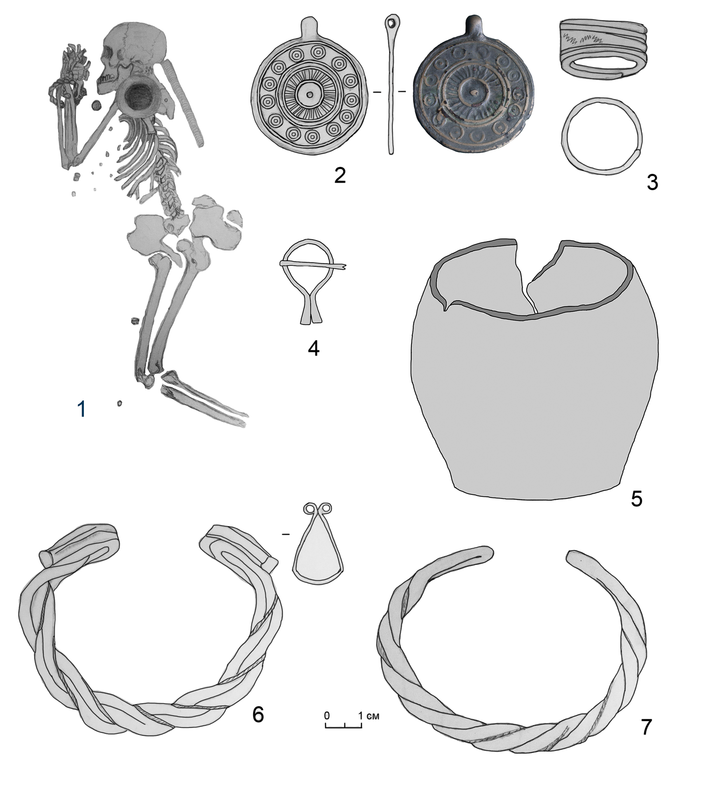 2 – медальон с календарем; 3 ‒ перстень; 4 – сюльгама; 5 – глиняный сосуд; 6, 7 – браслеты