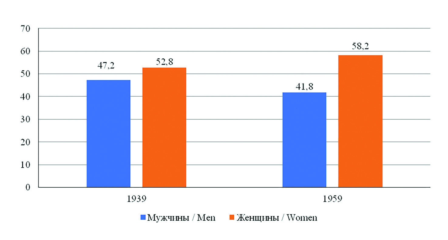 В изучаемый период среди удмуртского населения региона зафиксирована половая диспропорция, которая достигла своего максимума в период с 1939 по 1959 г. Данная тенденция была характерна для населения всей страны и являлась результатом демографических потерь, вызванных Великой Отечественной войной (рис. 1). Дисбаланс среди полов в данный период был характерен и для удмуртов, проживающих на территории Удмурткой АССР [5].