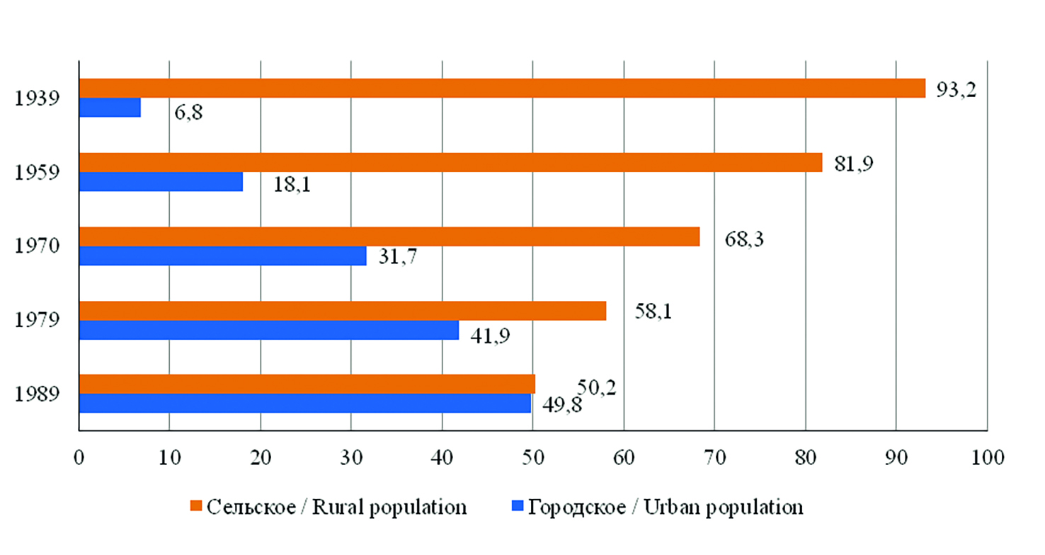 Рис. 2. Распределение удмуртов по типу населения (по данным Всесоюзных переписей населения), %*