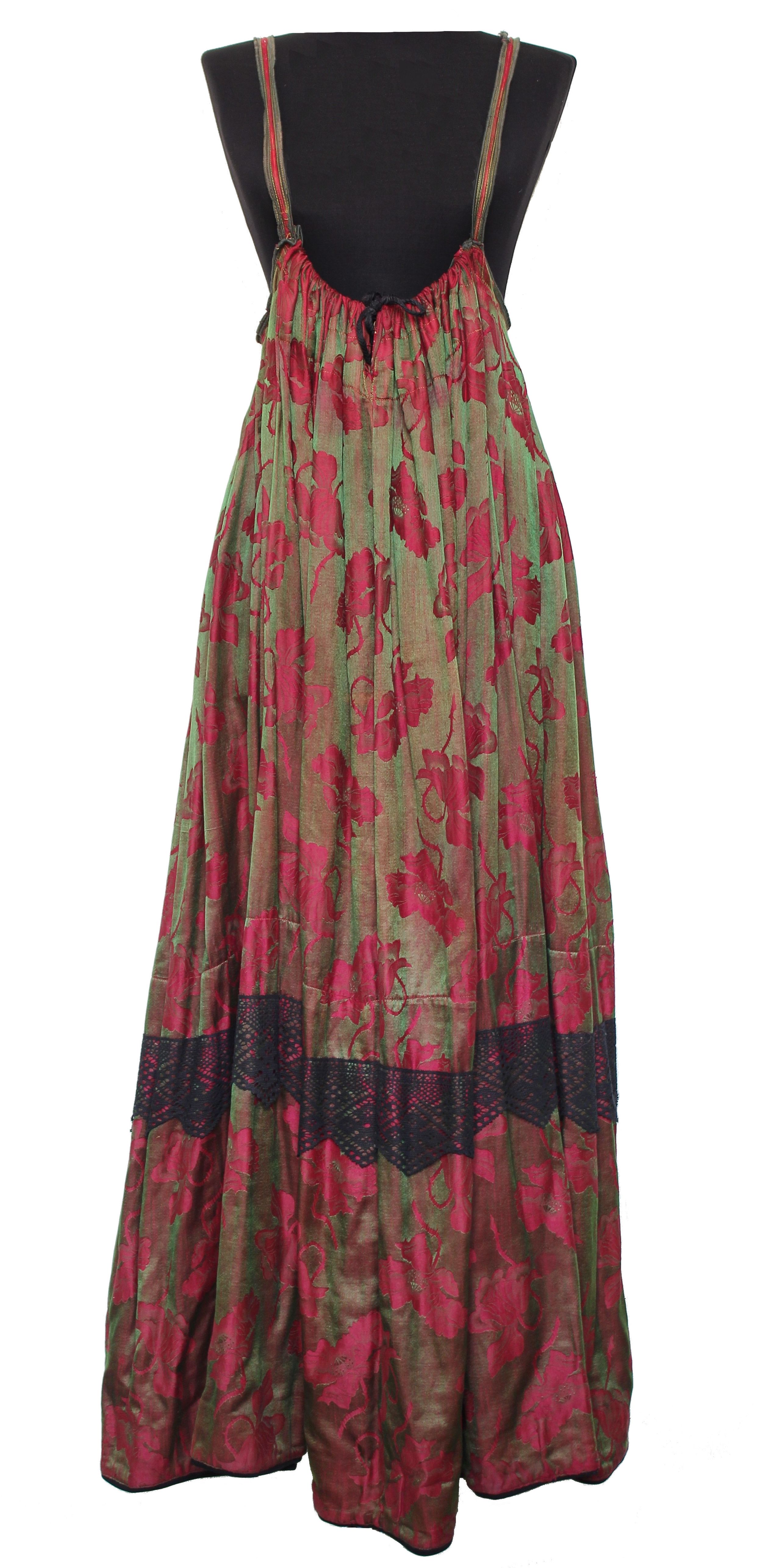 Сарафаны косоклинные и прямые, надеваемые поверх рубахи, изготавливали из шелковых тканей с растительным орнаментом, преимущественно холодных оттенков (темно-фиолетового, темно-зеленого, бордового, коричневого). Сарафаны шили из нескольких полотнищ, задняя часть собрана в крупные складки. На спинке по центру оформлена одна двойная складка, от которой в левую и правую стороны выполнены остальные. Спереди, в кромке между бретелями, продевается шнурок для затяжки прямого полотнища сарафана. Верхняя часть сарафана, собранная в складки, подшита подкладом. Складки прошиваются прямой строчкой. Между кромкой и прямой строчкой складки закрепляются декоративным швом «зигзаг». Пришивные лямки выполнялись из того же материала, что и сарафан. Лямки и верхний край сарафана обшивались тканью иной расцветки. В нижней части он украшен полоской черного фабричного либо самодельного кружева вахрам, связанного крючком из хлопчатобумажных нитей черного цвета, иногда также тремя защипами, выполненными по всей окружности сарафана. Край подола с изнаночной стороны подшит хлопчатобумажной тканью, к нему пришивается узкая бахрома, чтобы, как отмечают информанты, уберечь изделие от быстрого износа (рис. 3).
