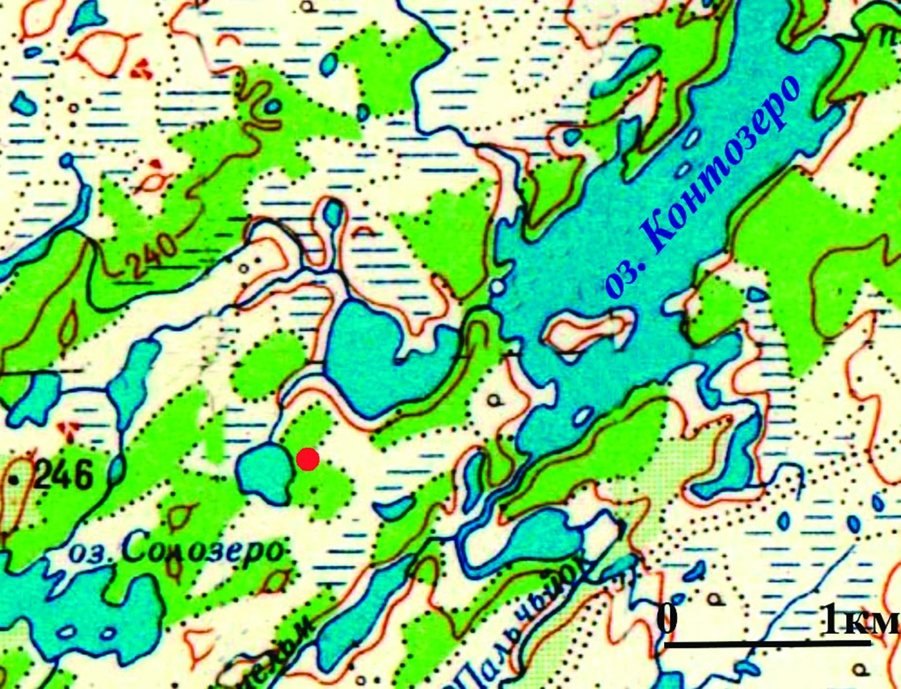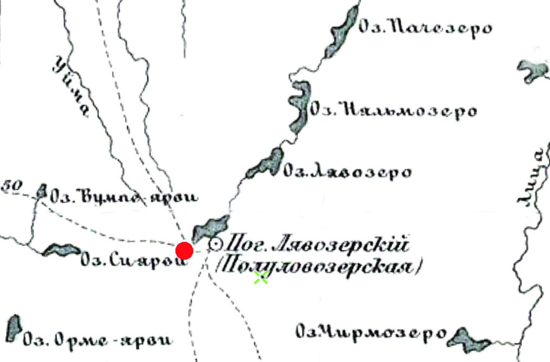 Fig. 4. Location of the Chapel of the Nativity of Christ on Lake Chesynyavr. Military road map of European Russia, 1888