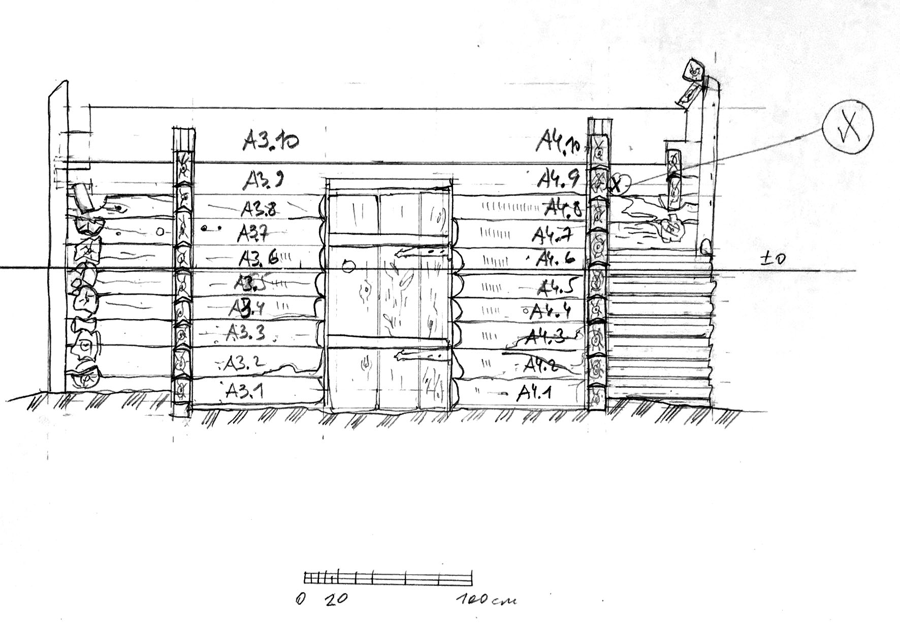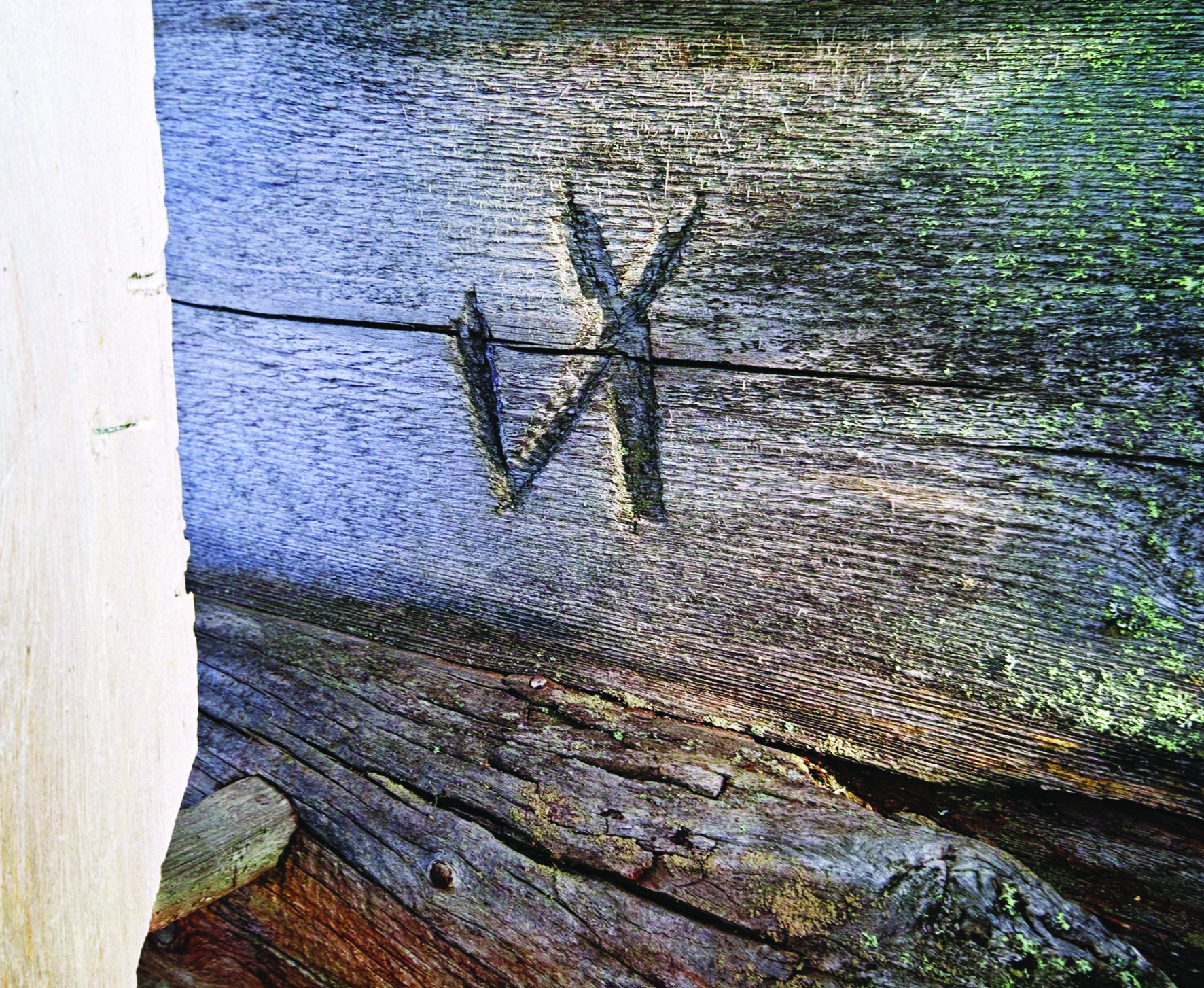 В контексте истории часовни интересно вырезанное на стене сеней клеймо (рис. 7). Тамга, которую можно увидеть на замененном бревне, указывает на относительно позднее время его происхождения. В списке саамских клейм А. Я. Комшилова 1927 г. оно отсутствует18. По сообщению местных жителей, этот знак принадлежит семье Шаршиных [9]. Возможно, они участвовали в ремонтных работах конца XIX в.19