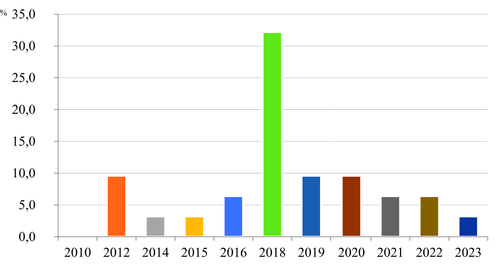 Материалом исследования послужил подкорпус финноязычных интернет-травелогов о России, собранный вручную в сети Интернет методом сплошной выборки, состоящий из 31 текста объемом 24 288 словоупотреблений. Временные рамки создания текстов ‒ 2010‒2023 гг. Процентное соотношение объема текстов по годам публикации отражено на рисунке 1.