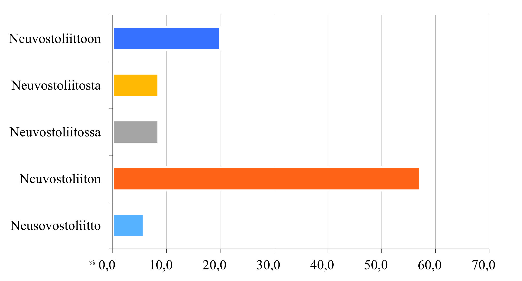 Генетивная форма Neuvostoliitto является превалирующей, при этом среди коллокаций выделяются: