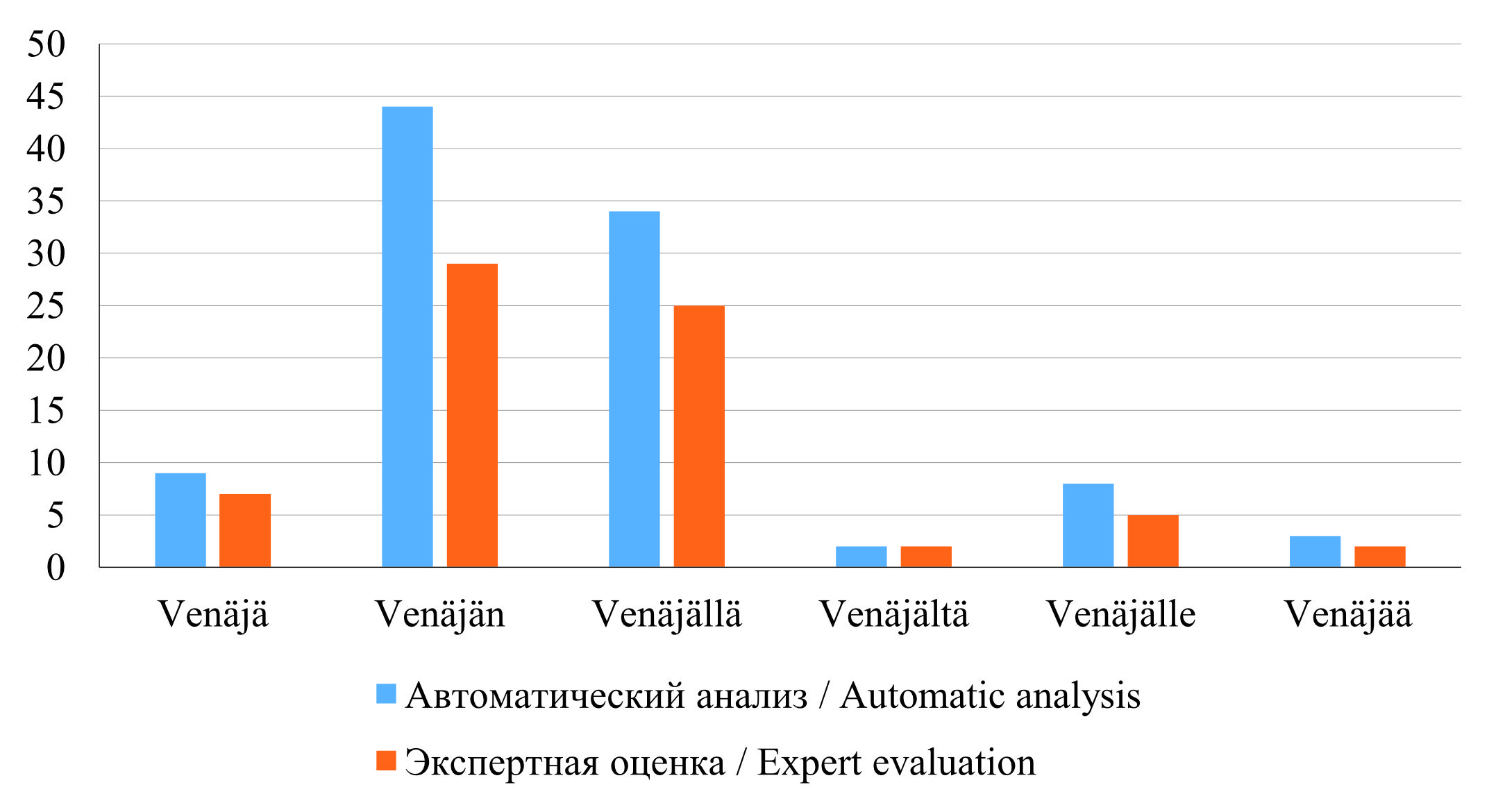 Из полученного корпуса при помощи корпусного менеджера AntConc были отобраны все контексты, включающие в себя словоформы Venäjä ‘Россия’, Neuvostoliitto ‘Советский союз’, itänaapuri ‘восточный сосед’, поскольку именно они представляют собой номинации страны в материале. Из числа выборки были исключены контексты с употреблением коллокации venäjän kieli ‘русский язык’ или venäjä в значении ‘русский язык’, поскольку они не соответствуют заявленным критериям. Таким образом, было получено 148 контекстов с коллокациями одного из вариантов номинации «Россия».