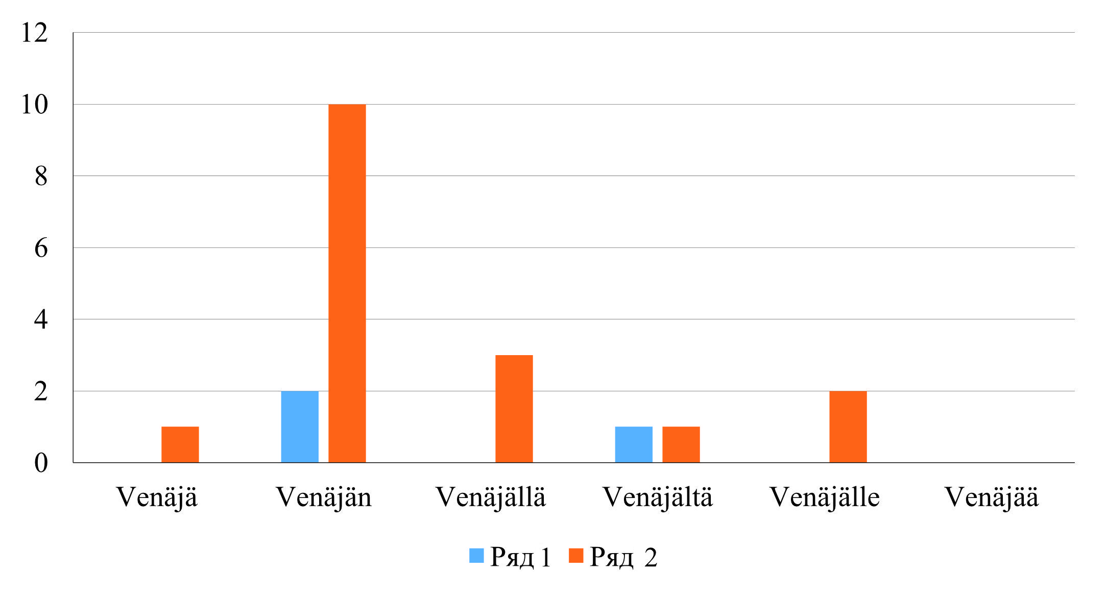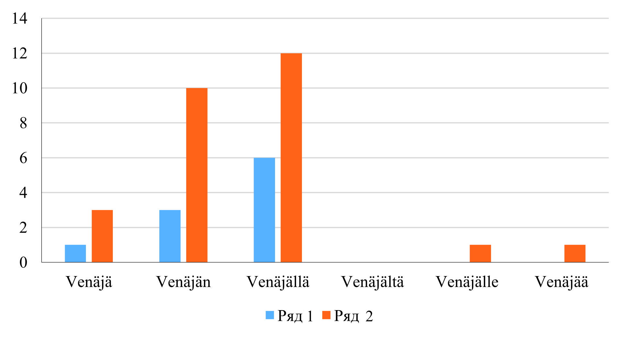 Подробнее проанализируем коллокации с единицей Venäjä. В первую очередь обращает на себя внимание распределение падежных форм. Наиболее частотными являются варианты Venäjän (генитивный оборот ‘России, русский, российский’) и Venäjällä (‘в России’) – 49 и 40 употреблений соответственно. Представим частотность словоформ в виде гистограммы (рис. 2).