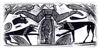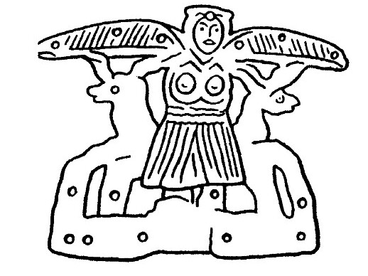 По ее бокам, в зеркальной симметрии, обычно помещались олени, кони, птицы, змеи, всадники, фантастические звери (в зависимости от разных культур). Часто женская фигура заменялась деревом, поскольку в традиционном искусстве мировое дерево является символом Богини-матери, ее семантическим заменителем.