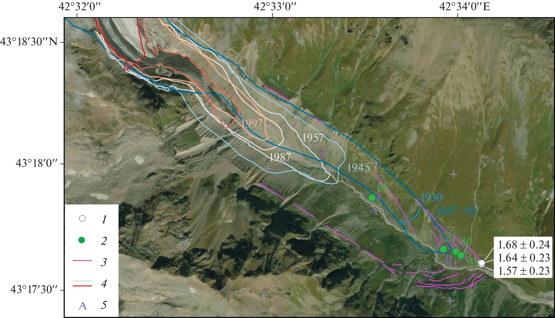 - Solomina O.N., Bushueva I.S., Volodicheva N.A., Dolgova E.A. Age of moraines of the Bolshoy Azau Glacier in the upper course of the Baksan River valley according to dendrochronological data. Led i Sneg. Ice and Snow. 2021, 61 (2): 271–290 [In Russian].https://doi.org/10.31857/S2076673421020088