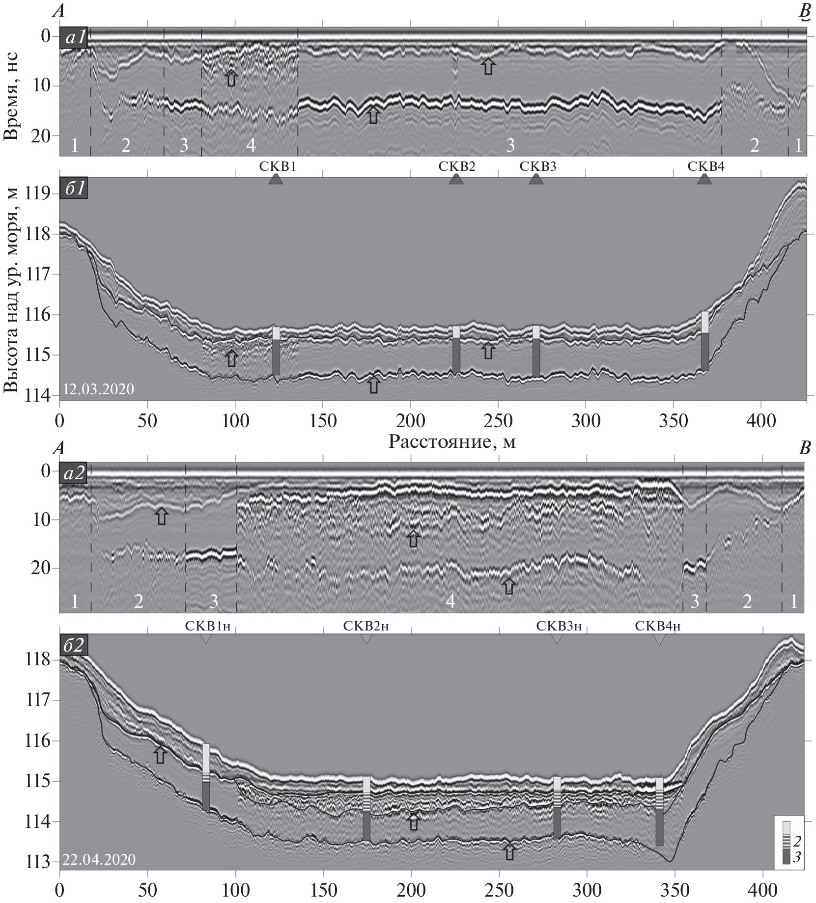 The results of observations and modeling of the formation of the snow-ice cover of Lake Stemme (West Svalbard Island) in winter 2019/20 are presented. The main information was obtained by two radar (GPR) survey, performed on the floating ice of the Lake on March 12 and April 22 of 2020. Authors believe that probably these observations were the first ones on the Lake. The use of the radar made it possible to obtain data on the dynamics of the thickness of the layers of snow and ice cover, the so-called “snow ice” which is formed when the boundary between snow and ice was submerged under water. During the time between records, the thickness of the last “snow ice” increased two to three times, i.e., from units to the first tens of cm, and it spread to the entire deep-water part of the Lake area. In addition, analysis of high-precision positioning of the radar records revealed a significant deflection in the ice surface in the central part of the Lake under the influence of snow load and the decreasing level of the reservoir. The calculations of the thermodynamics of the floating ice cover have shown that its thickening occurs as a result of the processes of congelation and isostatic ice formation, replacing each other at its lower and upper boundaries, respectively. At the same time, the formation of “snow ice” violates the characteristic feature of decreasing of ice thickness with growth of the snow thickness, which significantly influences on the thermal and mass balance of the Lake snow-ice cover. Results of calculations of the ice cover deformation did show that it takes place not only due to the elastic, but also to the viscous properties of ice, and it is concentrated in a narrow coastal zone. The maximum radial stress is reached at a distance of several meters from the shore, where a circular crack parallel to the shoreline is formed. Such a crack is formed at all ice thicknesses at about the same distance from the shore.