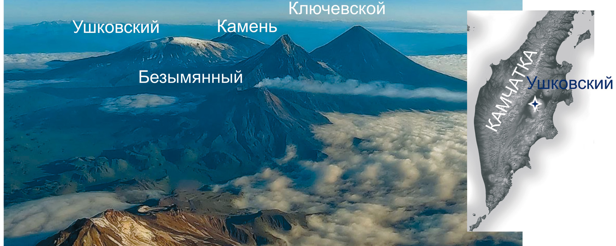 Fig. 1. Ushkovsky volcano surrounded by the largest volcanoes of the Kliuchevskoi group, view from the southeast in August, 2023. Photo by V. I. Frolov. The inset shows the regional position of the volcano.