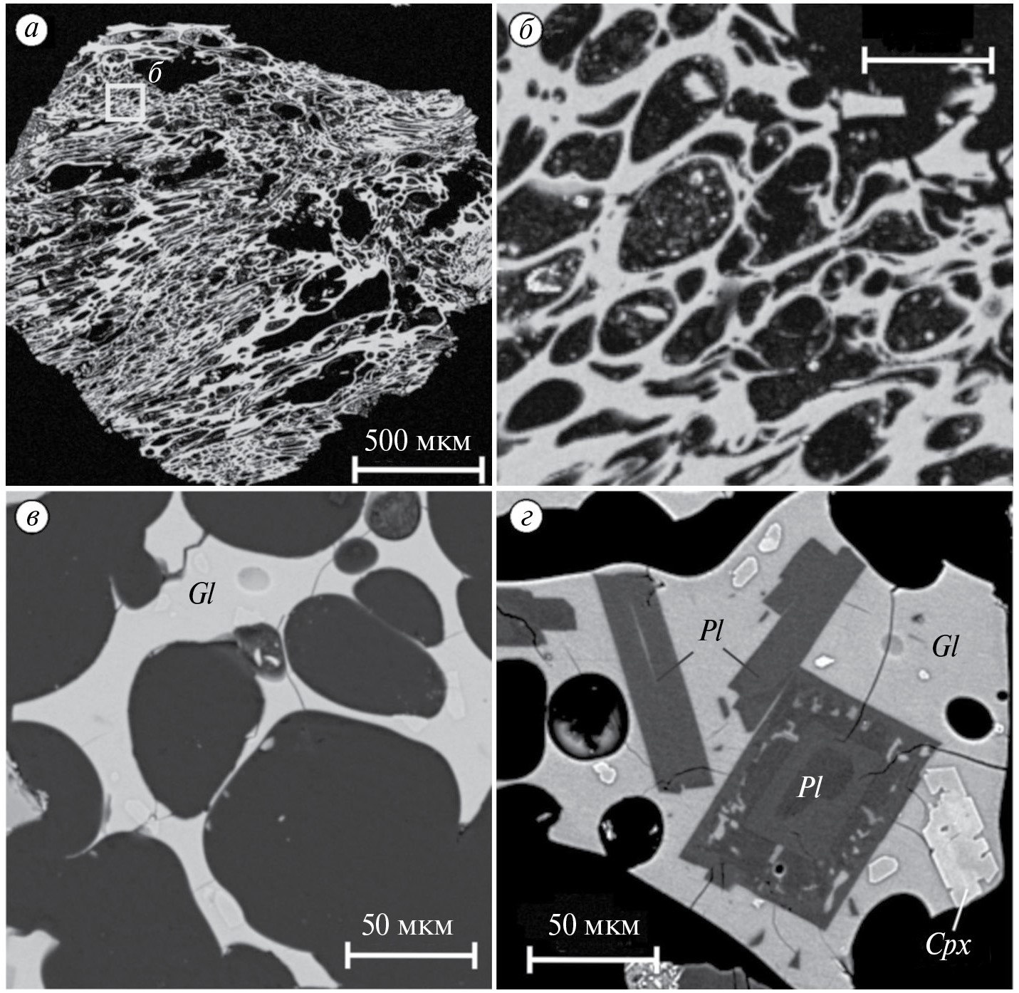 Fig. 2. Examples of ash particles completely (а–в) or partially (г) composed of volcanic glass: а — pumice particle from the soil profile in the area of Zhupanovsky volcano, Kamchatka; б — enlarged fragment of pumice; в-glass shard from the tephra from Kliuchevskoi volcano; г — glassy particle with microlites of pyroxenes and plagioclase, Kliuchevskoi volcano. Images are shown in the back-scattered electron mode: Cpx — clinopyroxene; Pl — plagioclase; Gl — glass.