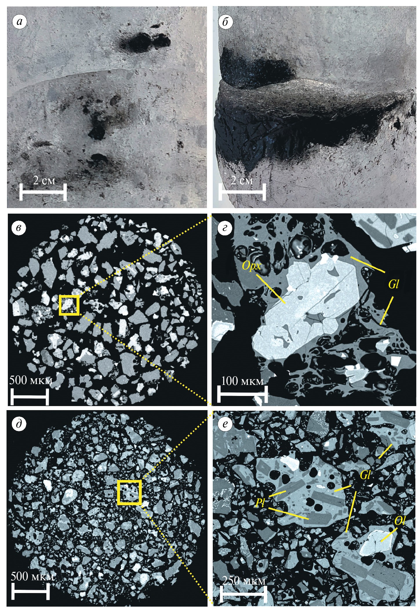 Рис. 3. Примеры образцов пеплов, захороненных в леднике вулкана Ушковский: a — фрагмент ледового керна, вмещающего тефру на глубине 762–777 см (образец Ush 762–777); б — фрагмент ледового керна, вмещающего тефру на глубине 828–834 см (образец Ush 828–834); в — облик пепловых частиц из образца Ush 762–777; г — стекловатая сильно пористая пепловая частица образца Ush 762–777 с вкрапленником ортопироксена (Opx), состав стекла (Gl) отвечает продуктам извержений вулкана Безымянный; д — облик пепловых частиц из образца Ush 828–834; е — стекловатые частицы пепла образца Ush 828–834 с микролитами пироксенов, плагиоклаза и оливина, вулкан Ключевской.
