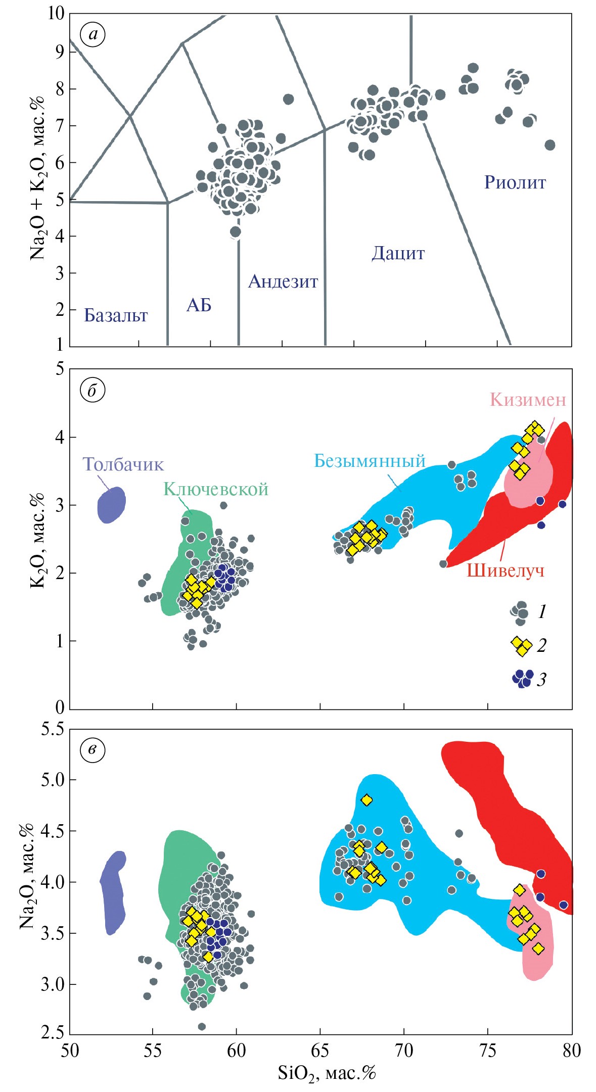 На диаграмме SiO2–K2O (см. рис. 4, б) видно, что группа стёкол андезибазальтового и андезитового составов попадает в поле стёкол извержений Ключевского вулкана, приведённых в работах (Пономарева и др., 2012; Portnyagin et al., 2020; Горбач и др., 2022). Принадлежность этой группы стёкол к продуктам извержения Ключевского вулкана подтверждается и особенностями минерального состава пеплов с типичной для базальтов-андезибазальтов этого вулкана оливин-пироксен-плагиоклазовой ассоциацией субвкрапленников и микролитов (Озеров, 2019; Горбач и др., 2022). К этой группе отнесены вулканические стёкла 9 изученных образцов.