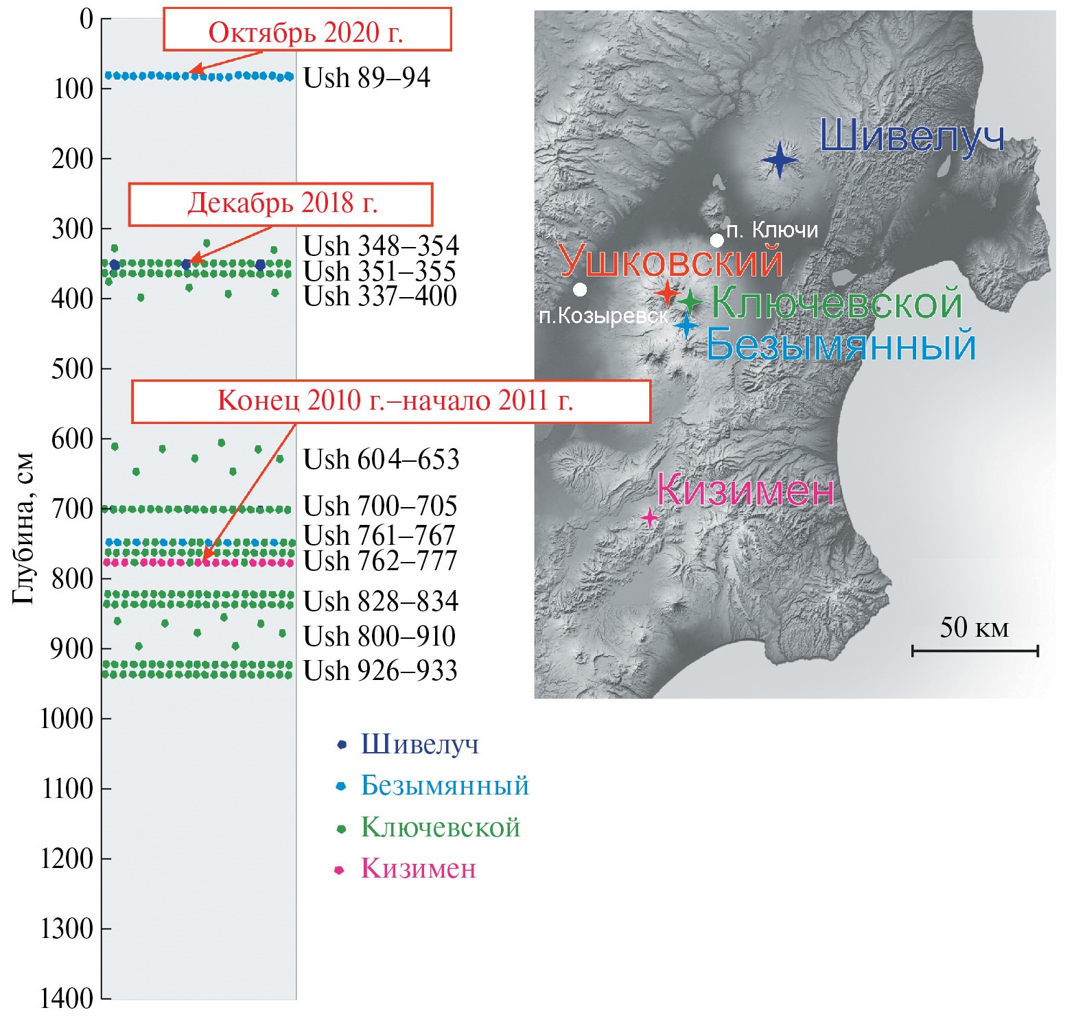Вулкан Кизимен, пепловые частицы которого были обнаружены в составе смешанной популяции пеплов образца Ush 762–777, расположен в ~100 км к юго-западу от кратерного ледника вулкана Ушковский (см. рис. 5, врезка). С 2010 по 2013 г. на вулкане происходило масштабное эксплозивно-эффузивное извержение (Мельников и др., 2011; Малик и др., 2012; Гирина и др., 2014, 2018). Согласно работе (Мельников и др., 2011) кульминация эксплозивной активности пришлась на конец 2010 — начало 2011 г., когда протяжённые (≥ 500 км) эруптивные облака распространялись в том числе и в северо-западном направлении. В середине декабря в пос. Козыревск (примерно 110 км к ССЗ от вулкана Кизимен и в 35 км к ЮЗ от вершины вулкана Ушковский) было отмечено выпадение светло-серого пепла алевритовой размерности (Мельников и др., 2011). Пепел, выпавший в декабре в районе пос. Козыревск, был проанализирован и охарактеризован в работе (Пономарева и др., 2012). Было подтверждено, что состав стёкол пепловых частиц отвечает продуктам извержения вулкана Кизимен, а кроме того, было обнаружено, что образец пепла, отобранный со снега, содержит примесь частиц вулкана Ключевской. В смешанной популяции частиц образца из ледового керна Ush 762–777 также присутствуют частицы пеплов вулканов Кизимен и Ключевской (см. рис. 4, в), поэтому конец 2010 — начало 2011 г. можно считать наиболее вероятным временем выпадения этого пепла на лёд. Не противоречит этому выводу и присутствие в составе смешанной популяции образца Ush 762–777 частиц пеплов вулкана Безымянный. Более того, в образце Ush 761–767, который частично дублирует образец Ush 762–777 и отвечает его верхней части, обнаружены пепловые частицы только вулканов Ключевской и Безымянный. Это означает, что пепел Кизимена был отложен ранее, а впоследствии перекрыт пеплами извержений Ключевского и Безымянного. По данным (Гирина и др., 2018; Озеров и др., 2020), извержение вулкана Ключевской происходило субсинхронно извержению вулкана Кизимен в декабре 2010 г., а извержение вулкана Безымянный с распространением пепловых шлейфов к СЗ, в сторону кратерного ледника, произошло несколькими месяцами позже — в апреле 2011 г.