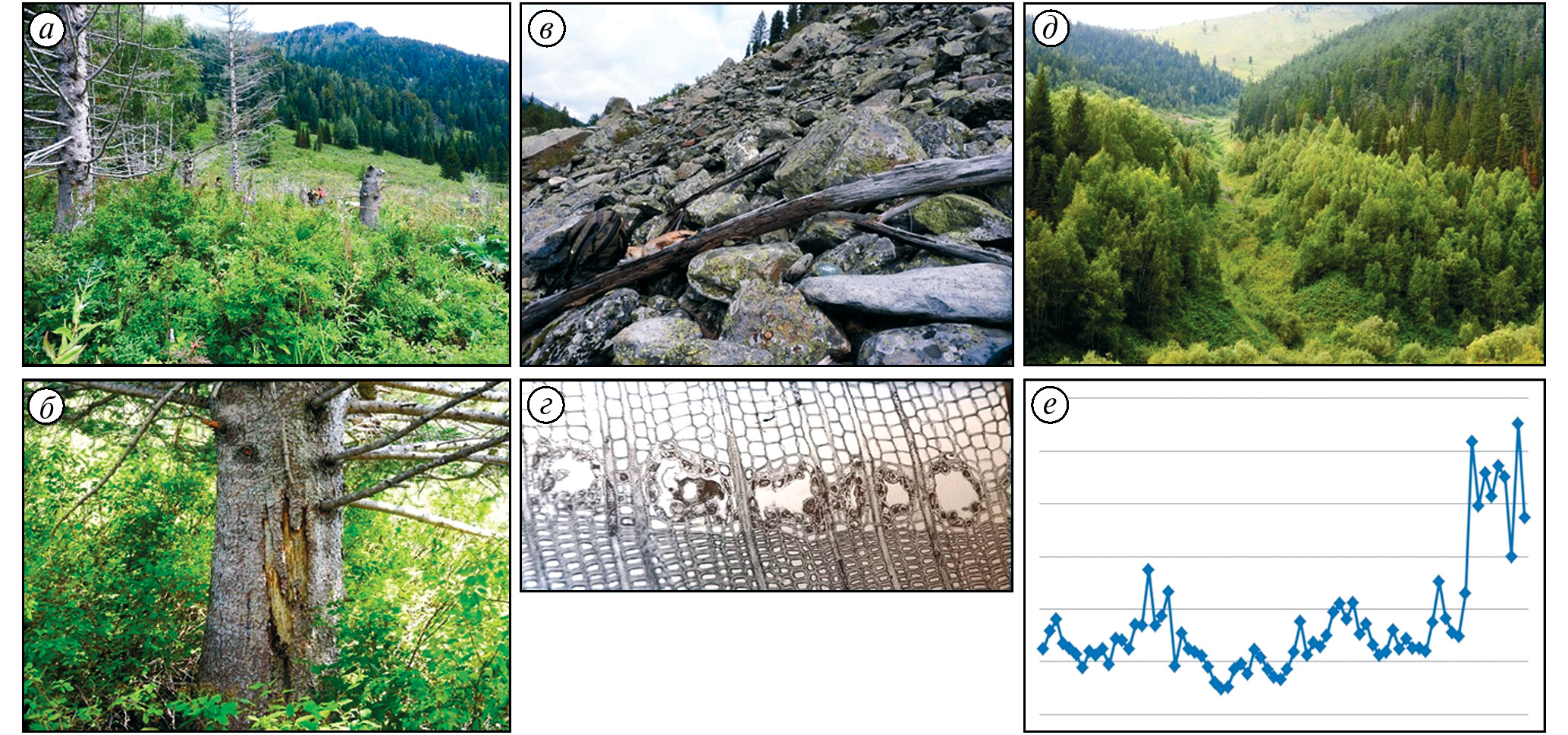 Fig. 1. Signs of avalanche activity: a — death of trees on the periphery of avalanche accumulation zone 3 (photo 2022); б — wounds on tree trunks caused by an avalanche; в — dead trees in the avalanche accumulation zone 1 (photo 2022); г — traumatic resin passages in fir (photo from (Benkova, Schweingruber, 2004)); д — avalanche combing, avalanche collection 1; е — example of a sharp increase in the radial growth of a tree (lightening effect) in avalanche collection.