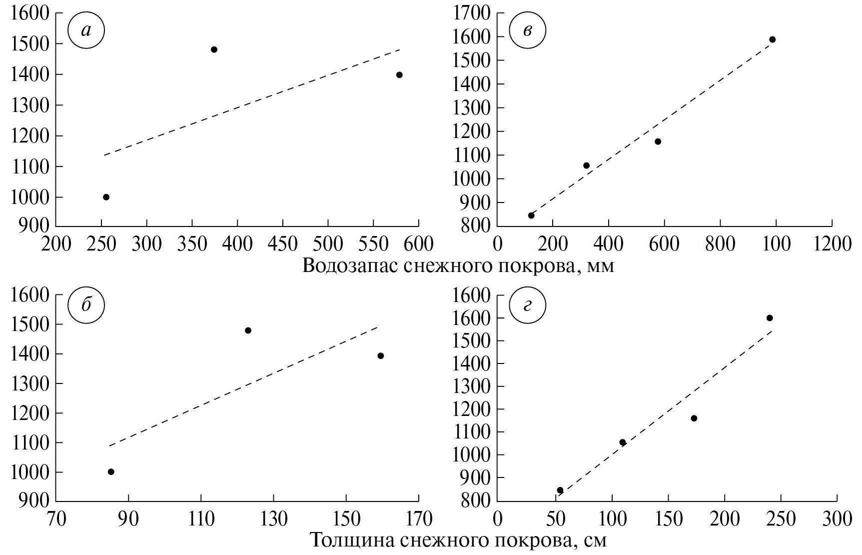 Fig. 3. The distribution of the thickness and water content of snow cover by height in the basin of the river Korgon according to field measurements: a — snow cover water reserve in March 1987; б — thickness of snow cover in March 1987; в — snow cover water reserve in February 1988; г — snow cover thickness in February 1988.