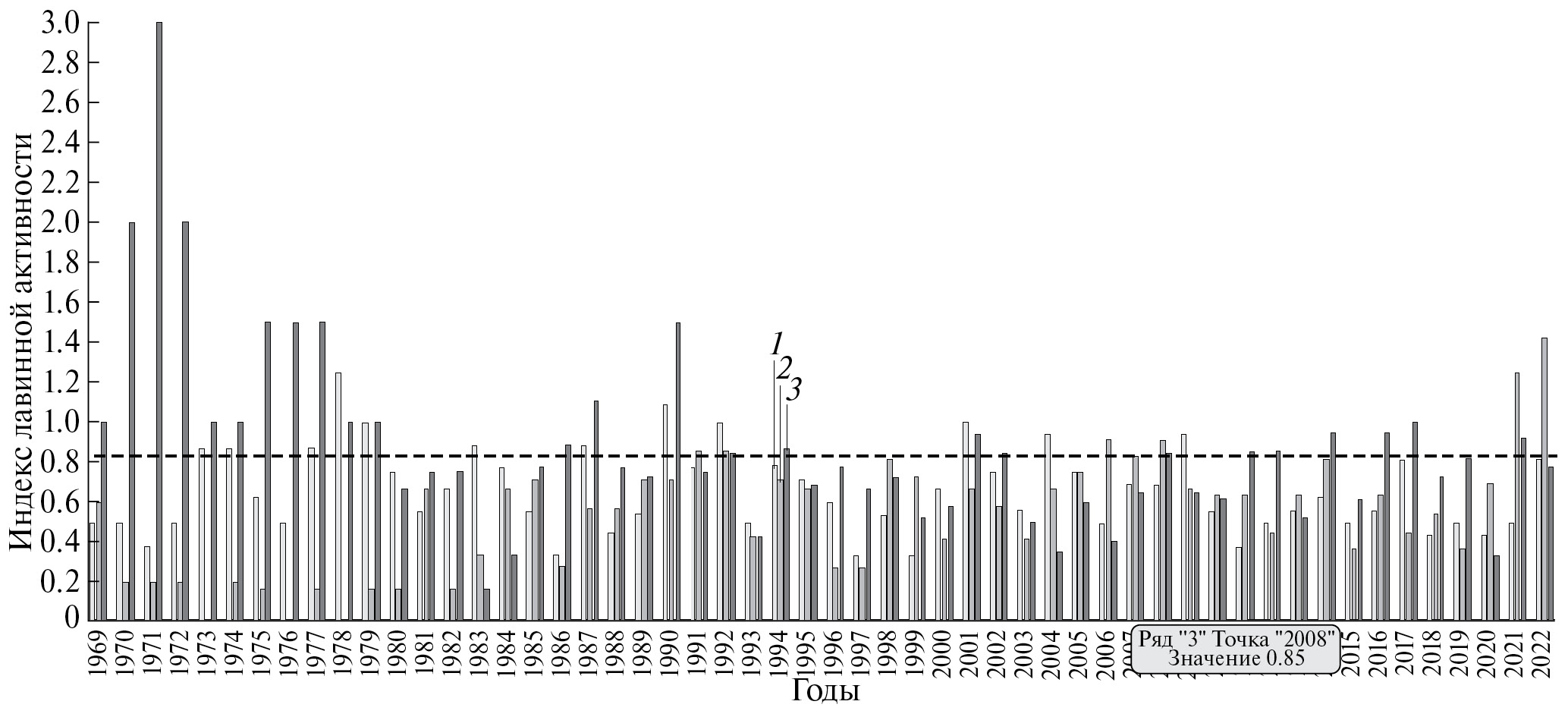 Designations on the diagram: 1 — avalanche collection 1; 2 — avalanche collection 2; 3 — avalanche gathering 3; 4 — atmospheric precipitation for October–April. The dotted line indicates the level of the dendrochronological index of avalanche activity equal to 0.85. The location of avalanches is shown in Fig. 1.