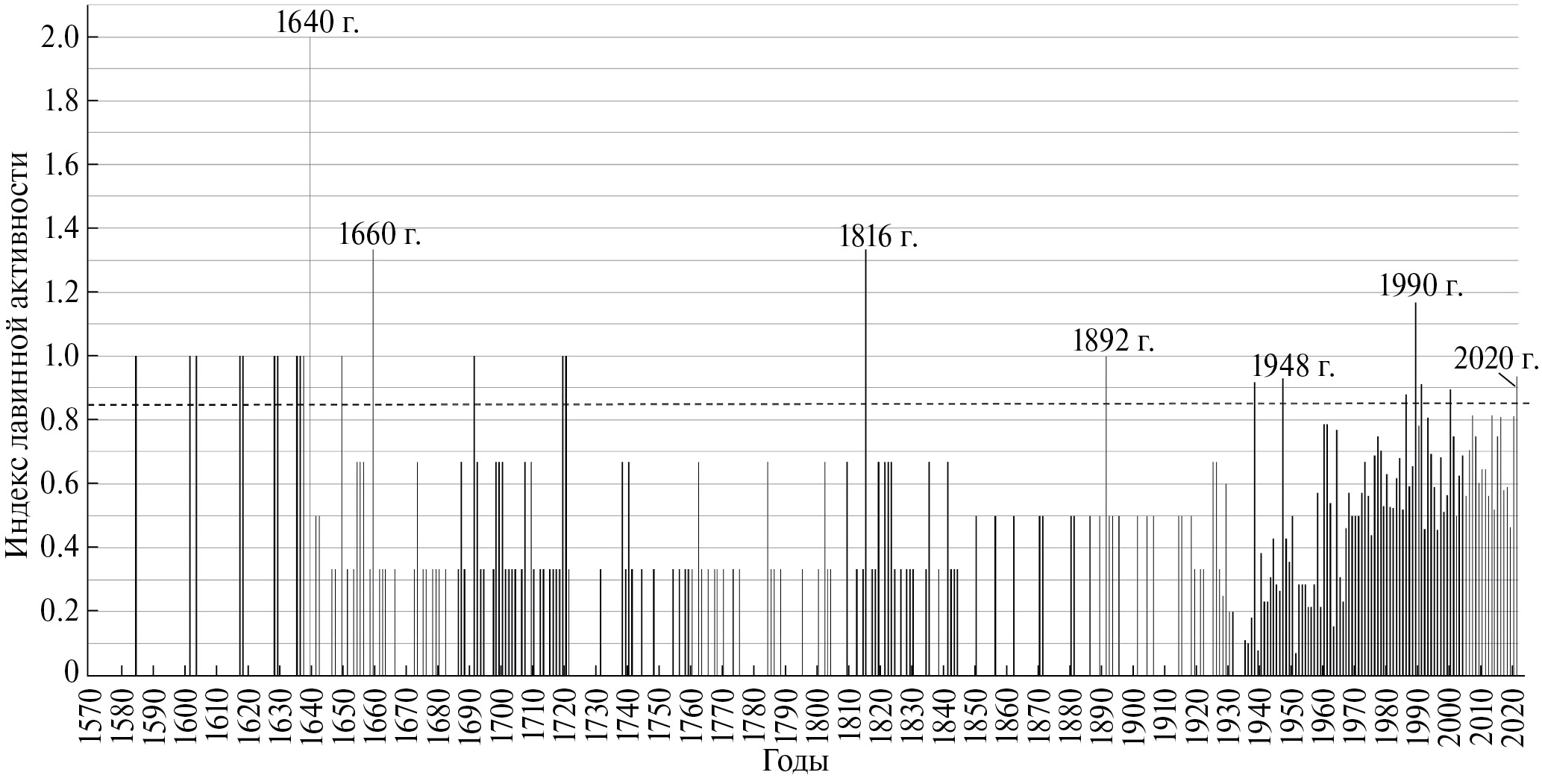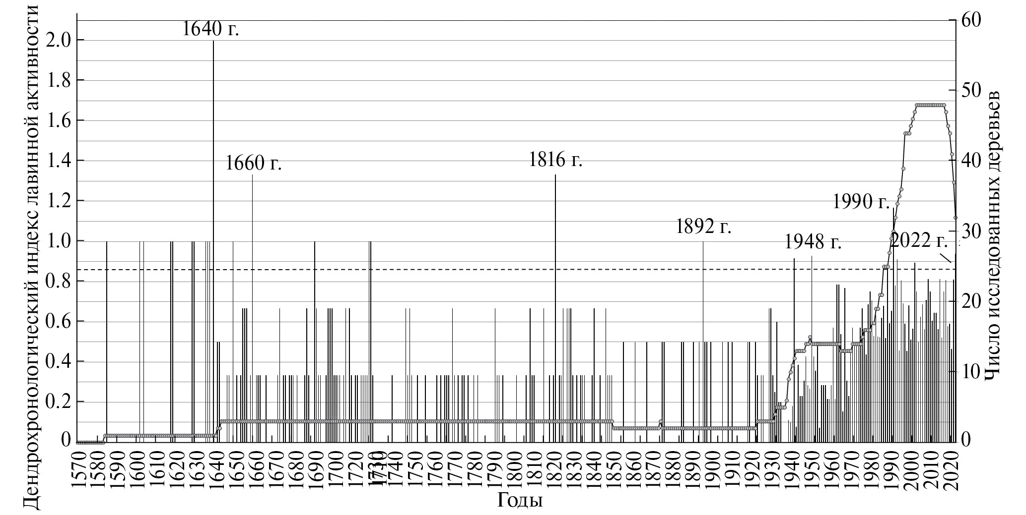 Дендрохронологический индекс лавинной активности, полученный по всем деревьям исследованных лавиносборов, свидетельствует о том, что максимальные лавины в бассейне р. Горелый Коргон сходили в 1585, 1602, 1604, 1618, 1619, 1629, 1630, 1636–1638, 1640, 1650, 1660, 1692, 1720, 1721, 1816, 1892, 1939, 1948, 1987, 1990, 1992, 2001, 2022 гг. (рис. 6). Таким образом, можно предположить, что в XVII и XX вв. максимальные лавины в исследуемом районе сходили чаще, чем в XVIII и XIX вв.