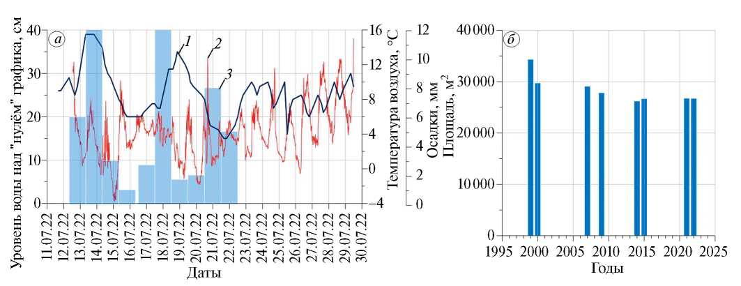 Fig. 5. Changes over time in hydrological and morphometric characteristics: relation of the water level on meteorological characteristics (a) and surface area (б) of the moraine lake «Tamozhеnoe» during the postregressive stage of evolution: 1 – course of water level at the water gauge on Lake «Tamozhenoye»; 2 – course of air temperature; 3 – course of precipitation at a weather station located in the coastal zone of the lake 2770 m a. s. l.