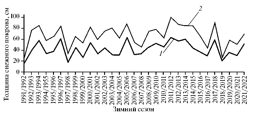 В связи с неоднородностью метеоданных до 1986 г. оценка снежности зим для городского округа «Город Южно-Сахалинск» была выполнена для периода 1986–2022 гг.