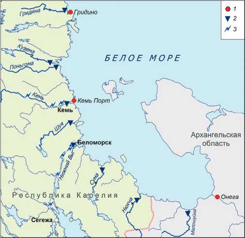 Рис. 1. Расположение метеорологических станций и гидрологических постов на западном побережье Белого моря (Республика Карелия и Архангельская область): 1 – метеостанция; 2 – гидрологический пост; 3 – ГЭС