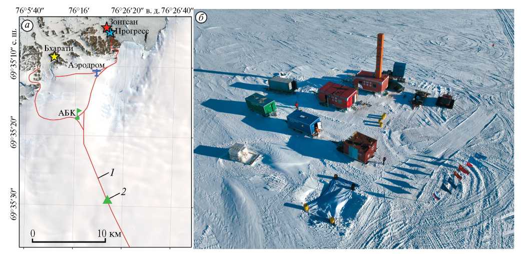 Рис. 1. Положение буровой скважины на леднике в северо-западной части Земли Принцессы Елизаветы (а): 1 – трасса СГП, 2 – скважина; звёздами показаны научные станции; полевой лагерь «Аномалия», расположенный на трассе Прогресс – Восток (трасса видна в правом верхнем углу фотографии) (б)