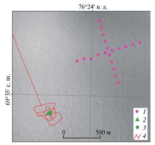 Рис. 2. Схема профилей радиолокационного зондирования и положение снегомерного полигона в районе буровой скважины на «Аномалии»: 1 – снегомерные вехи; 2 – буровая; 3 – кернохранилище; 4 – профили радиолокационного зондирования