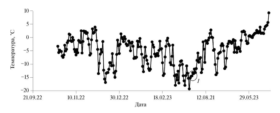 Рис. 1. Средняя суточная температура воздуха на метеостанции Баренцбург за период с октября 2022 г. по июнь 2023 г; 1 − период, выбранный для анализа