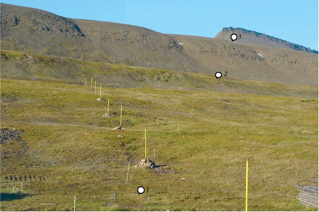 Температура грунта. Для получения температурного профиля в грунте на разной высоте над уровнем моря (НУМ) в сентябре 2022 г. были установлены и сняты в сентябре 2023 г. термохроны, в точках: т. 1 расположена в 100 м на юго-запад от метеоплощадки (на высоте 70 м НУМ); т. 2 − около края первой террасы на высоте 100 м НУМ на юг от т. 1 на расстоянии 300 м; т. 3 − на склоне г. Улаф (400 м НУМ). Места расположения термохрон представлены на рис. 2. Точки расположены вдоль многолетнего маршрута проведения измерений в районе пос. Баренцбург. Температуру грунта измеряли температурными логгерами iButtons DS1922L/DS1922T. Термохроны были установлены на глубинах 0, 10, 30, 50 и 70 см. Интервал измерения температуры грунта составлял 2 часа. Характеристики температуры грунта за период 23−26 марта 2023 г. приведены в таблице.