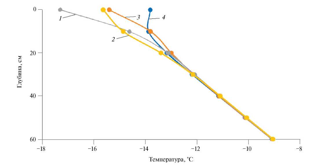В т. 1 разность температуры воздуха и температуры поверхности грунта под снегом 23−26 марта составила около 8.5 °C. Тогда как в т. 2 температура поверхности грунта под снегом составила −13 °C, что только на 1.2 °C выше, чем температура воздуха на высоте 100 м НУМ (при вертикальном градиенте температуры 0.7 °C на 100 м). Как правило, в этом месте толщина снега составляет обычно несколько десятков сантиметров из-за ветрового сноса снега с кромки террасы. В т. 3 средняя температура поверхности грунта составила −16 °C при стандартном отклонении 1.4 °C. При этом температура воздуха на высоте 400 м НУМ составила −16.4 °C. Эти данные говорят о небольшой толщине снега в точках 2 и 3. Так, в работе (Шмакин и др., 2014) отмечается, что перепаду между температурой воздуха и температурой поверхности грунта около 2 °C соответствует толщина снежного покрова менее 15 см. Из-за небольшой толщины снежного покрова измерения температуры грунта в т. 2 и т. 3 не показали наличие квазистационарного режима.
