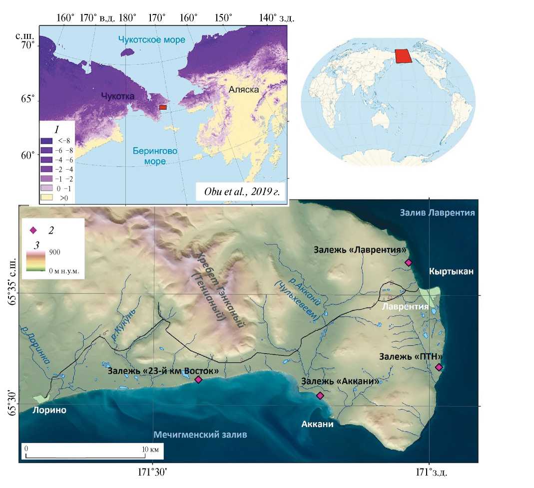 Восточная Чукотка – один из регионов широкого распространения пластовых льдов. Они описывались в 1960-х годах Ш.Ш. Гасановым (1969), который использовал только криолитологический метод. Генезис большинства залежей был определён как повторно-инъекционный. В последнее десятилетие был опубликован ряд статей, посвящённых залежам пластовых льдов в районе села Лаврентия на Восточной Чукотке. В частности, были опубликованы сведения о криолитологическом строении и изотопном составе залежей и выдвинуты предположения об их генезисе (Васильчук, 2016; Васильчук и др., 2018, 2018a). Однако генезис некоторых залежей на данный момент остаётся дискуссионным (Маслаков и др., 2018; Белова и др., 2019; Vasil’chuk et al., 2021; Маслаков и др., 2021).
