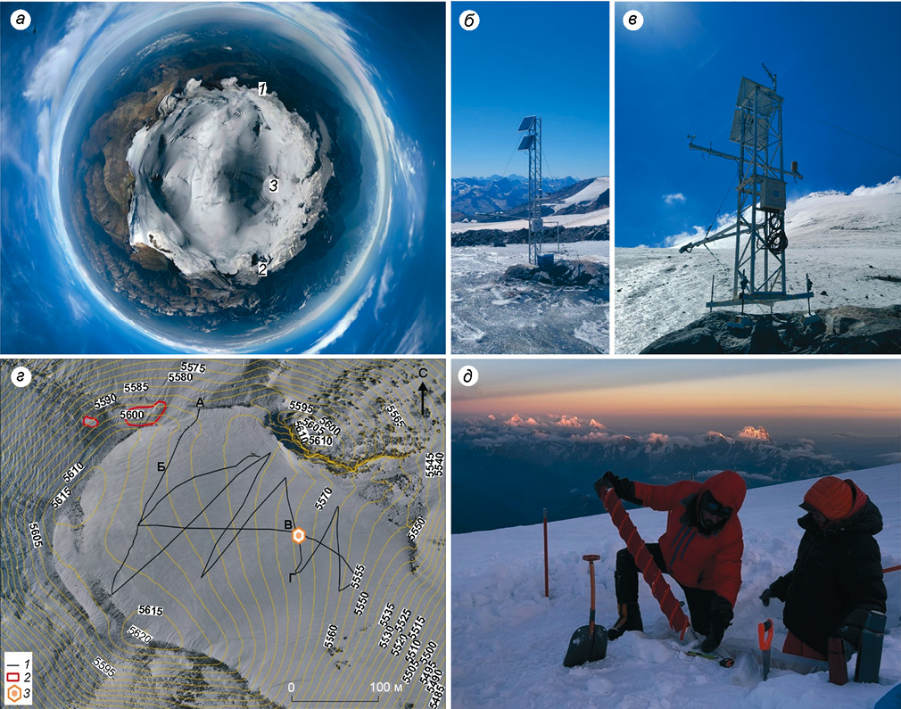 Fig. 1. Study area: (а) general view from UAV, AWS sites undicated: 1 – on Mikelchiran Glacier, 2 – on Garabashi Glacier, 3 – study site in the crater near the Elbrus East Summit; (б) AWS on Garabashi Glacier; (в) AWS on Mikelchiran Glacier; (г) – studies in the crater of the East Elbrus Summit: 1 – RES profiles, 2 – fumarole fields, 3 – snow pit and drilling site